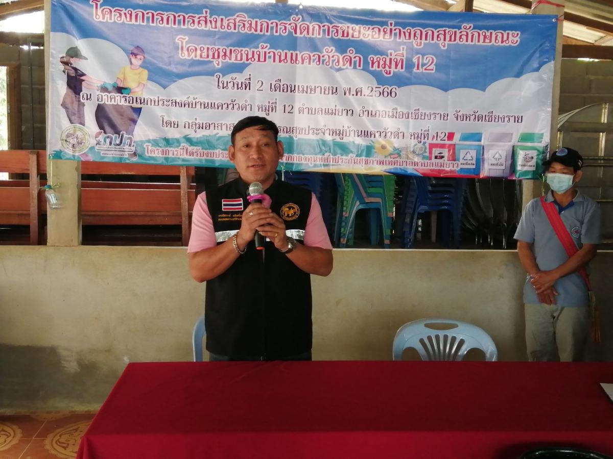 วันที่ 2 เมษายน 2566 นายกเทศมนตรีตำบลแม่ยาว ได้มอบหมายให้ นาย​อัครพงษ์​ เฉลิม​เลี่ยมทอง​ รองนายกเทศมนตรีตำบลแม่ยาว พร้อมด้วย กองสาธารณสุขฯ และคณะกรรมการติดตามโครงการฯ ร่วมเปิดโครงการการส่งเสริมการจัดการขยะอย่างถูกสุขลักษณะโดยชุมชน บ้านแคววัวดำ หมู่ที่ 12​ ณ หอประชุมอเนกประสงค์ บ้านแคววัวดำ หมู่ที่ 12 ตำบลแม่ยาว