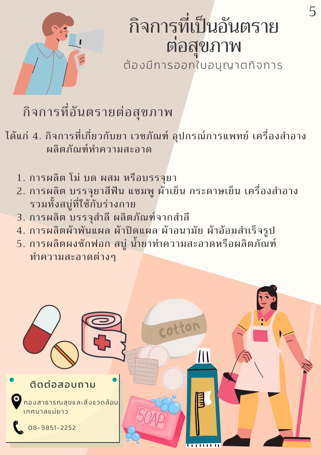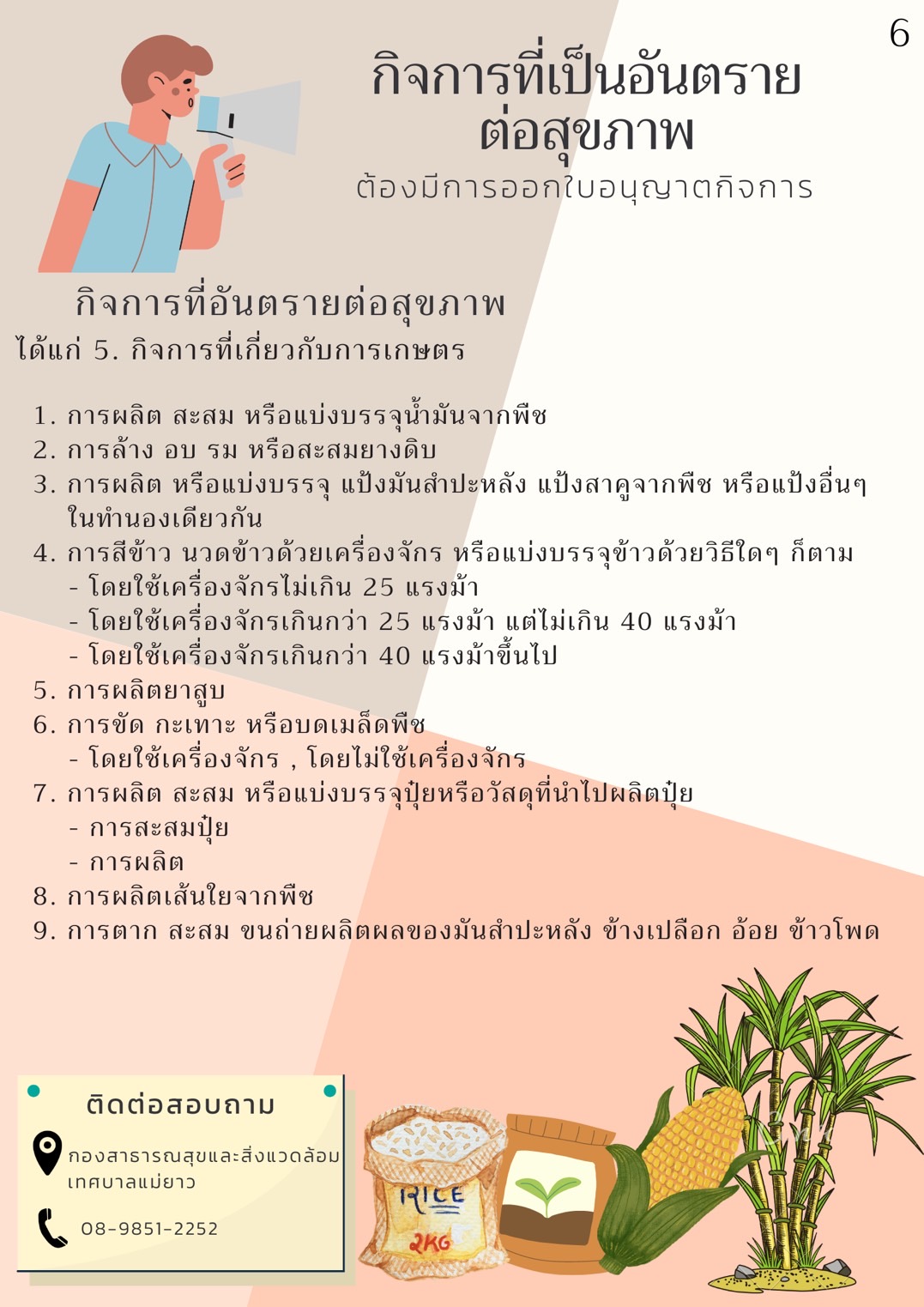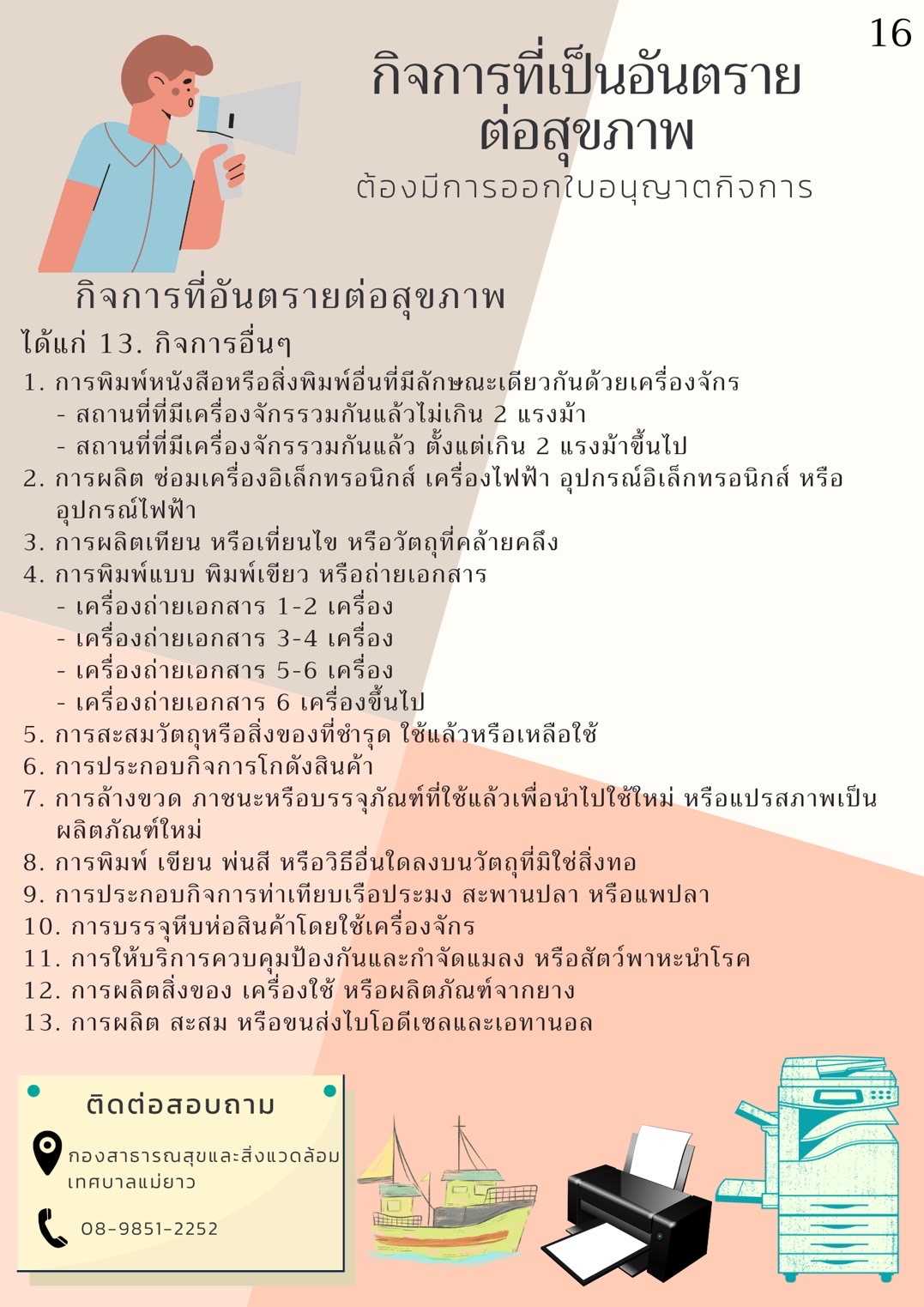- หากท่านประกอบกิจการที่เป็นอันตรายต่อสุขภาพ ต้องยื่นขอรับใบอนุญาตจากเทศบาลตำบลแม่ยาว นะ