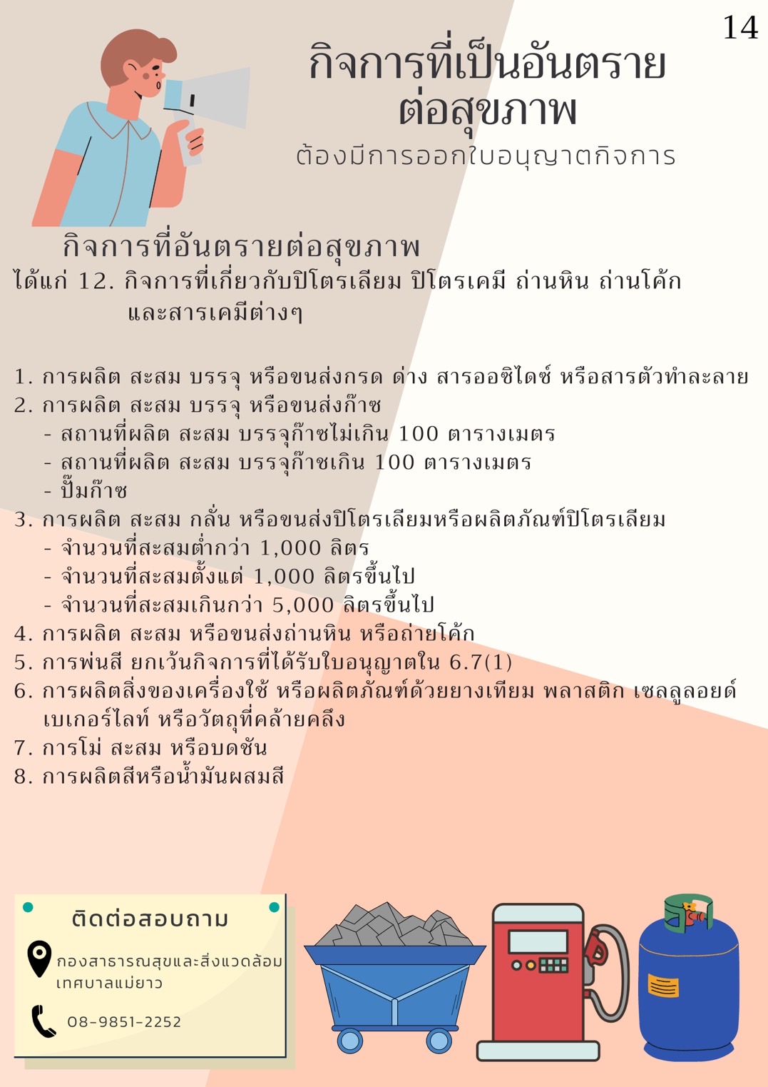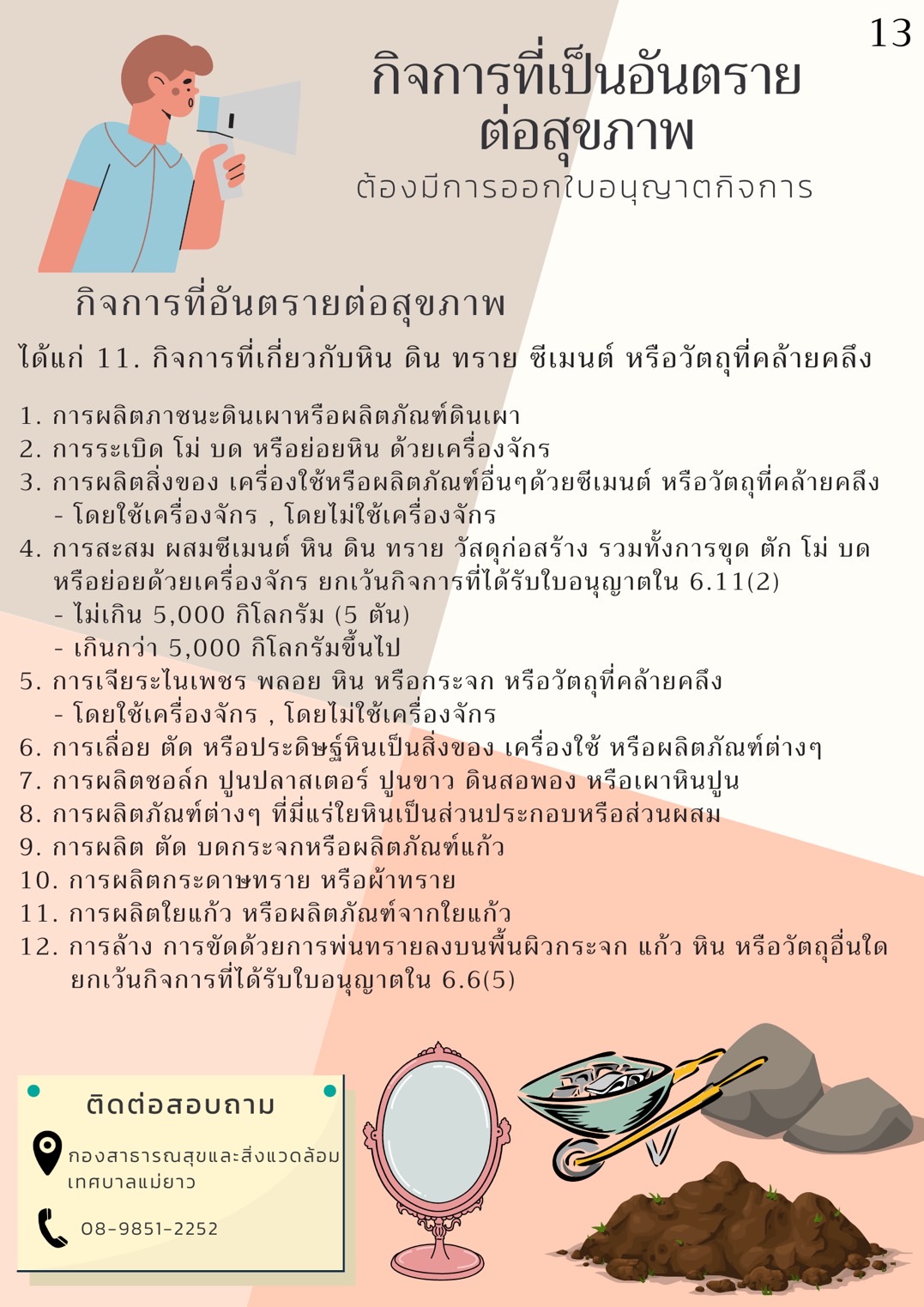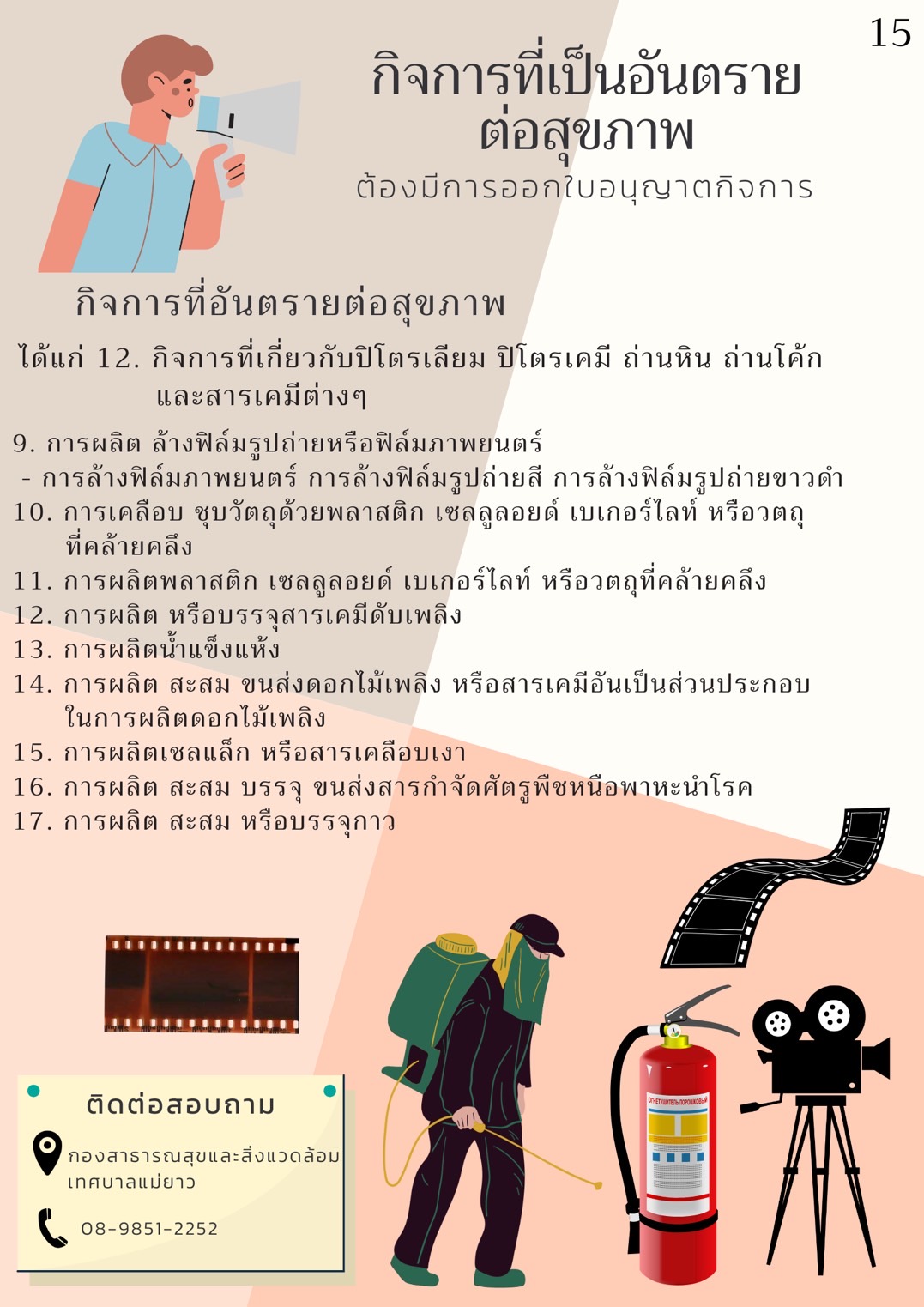- กิจการที่เป็นอันตรายต่อสุขภาพที่ต้องยื่นขอรับใบอนุญาตมีทั้งหมด 13 ประเภท 142 กิจการ