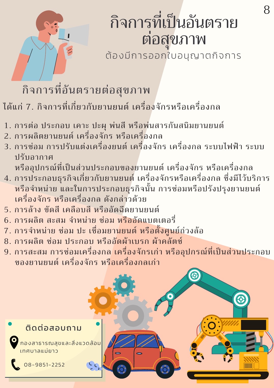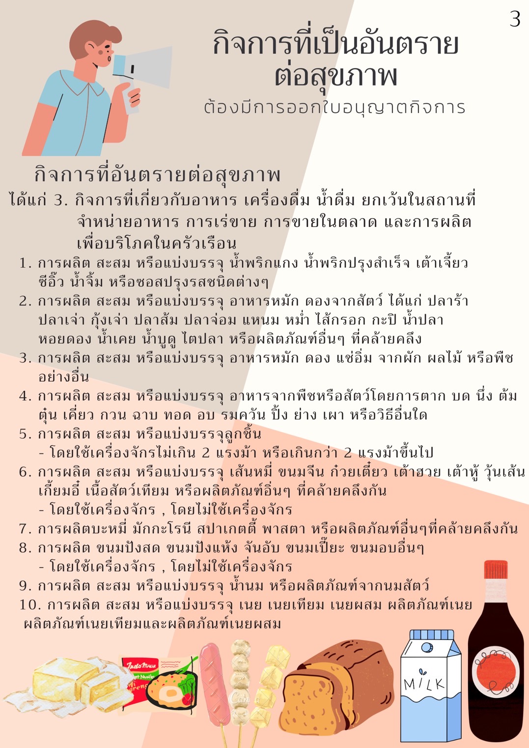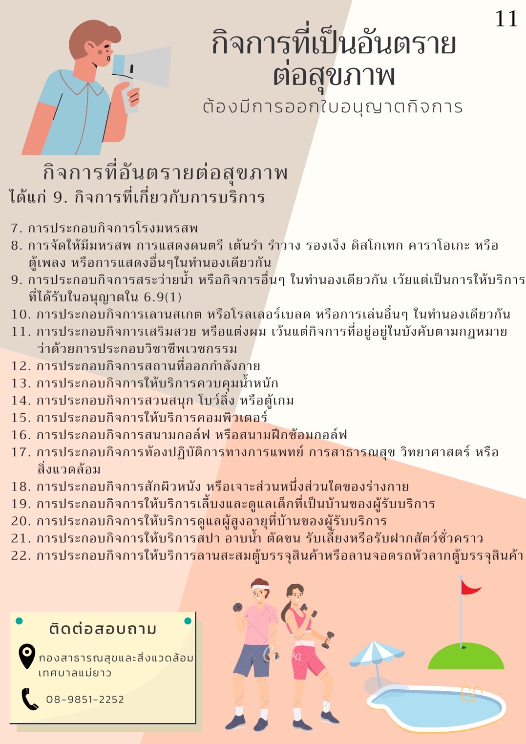 - กิจการที่เป็นอันตรายต่อสุขภาพที่ต้องยื่นขอรับใบอนุญาตมีทั้งหมด 13 ประเภท 142 กิจการ