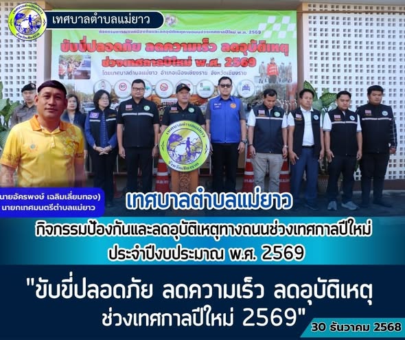 พิธีเปิด กิจกรรมรณรงค์และลดอุบัติเหตุทางถนนช่วงเทศกาลปีใหม่ 2569 ตั้งแต่วันที่ 30 ธันวาคม 2568 – 5 มกราคม 2569 โดย เทศบาลตำบลแม่ยาว เมื่อ 30-12-2568 | อ่าน 13 ครั้ง