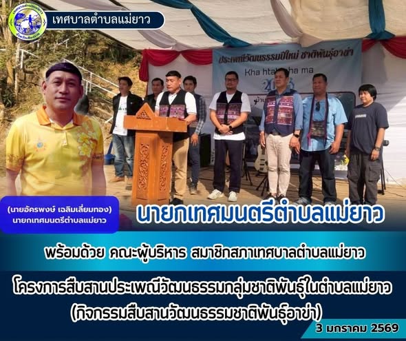 ครงการสืบสานประเพณีวัฒนธรรมกลุ่มชาติพันธุ์ในตำบลแม่ยาว (กิจกรรมสืบสานวัฒนธรรมชาติพันธุ์อาข่า) โดย เทศบาลตำบลแม่ยาว เมื่อ 03-01-2569 | อ่าน 13 ครั้ง