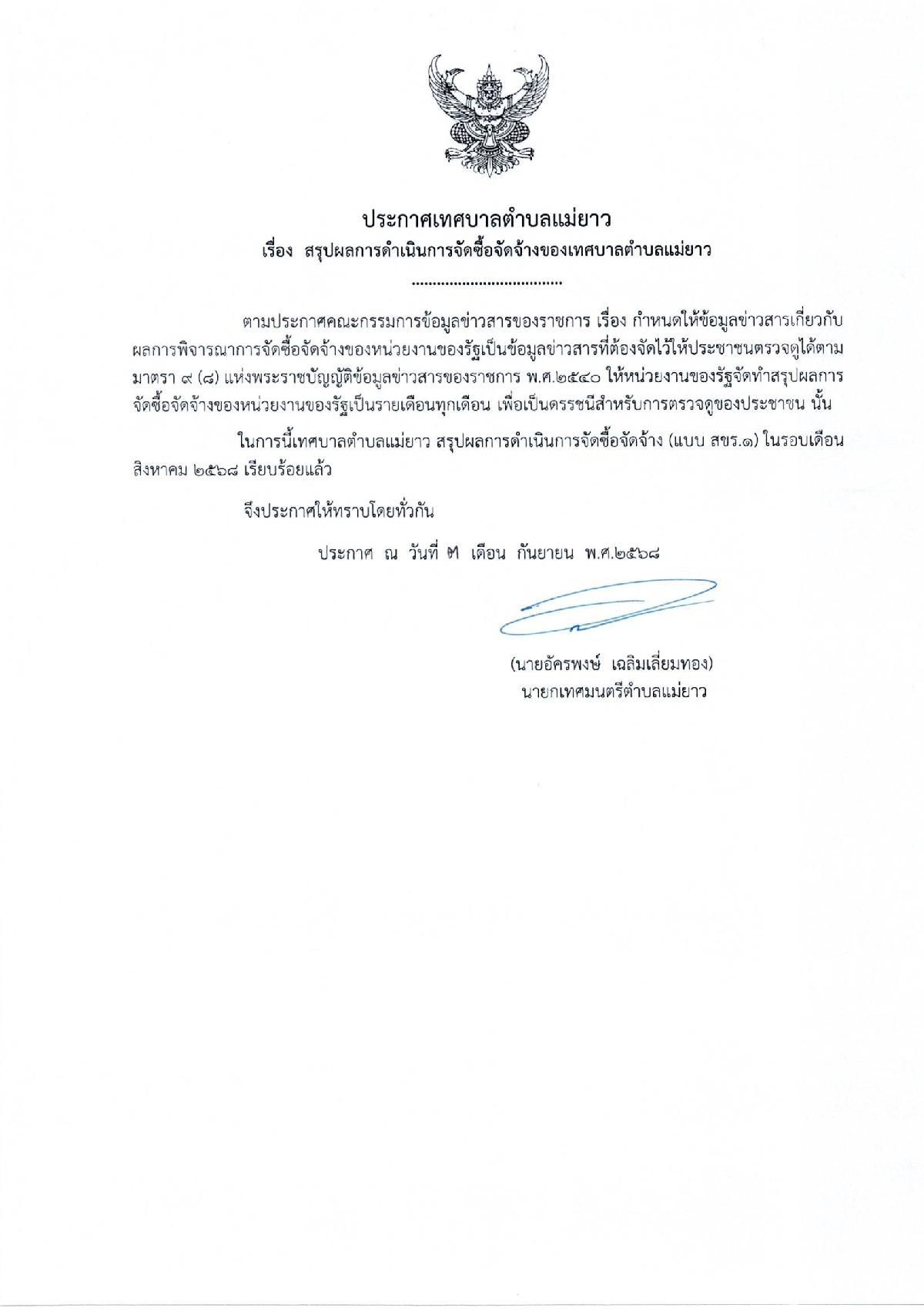 สรุปผลการจัดซื้อจัดจ้าง สขร.ประจำเดือนสิงหาคม 2568