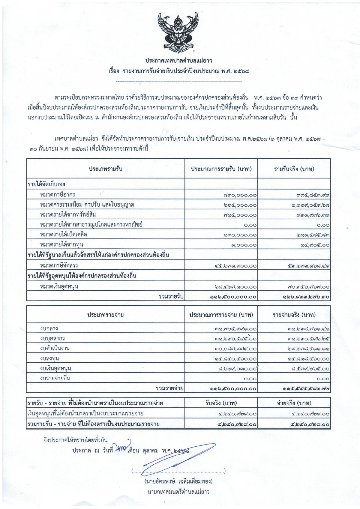 ประกาศเทศบาลตำบลแม่ยาว เรื่อง รายงานการรับจ่ายเงิน ประจำปีงบประมาณ พ.ศ 2568