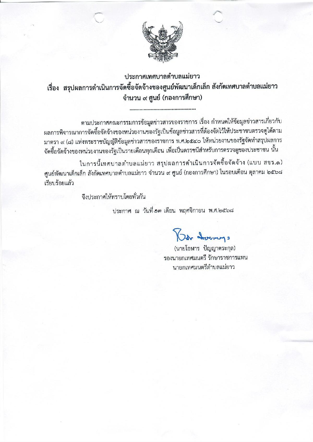 สรุปผลการจัดซื้อจัดจ้างของศูนย์พัฒนาเด็กเล็ก สังกัด กองการศึกษา ประจำเดือนตุลาคม 2568
