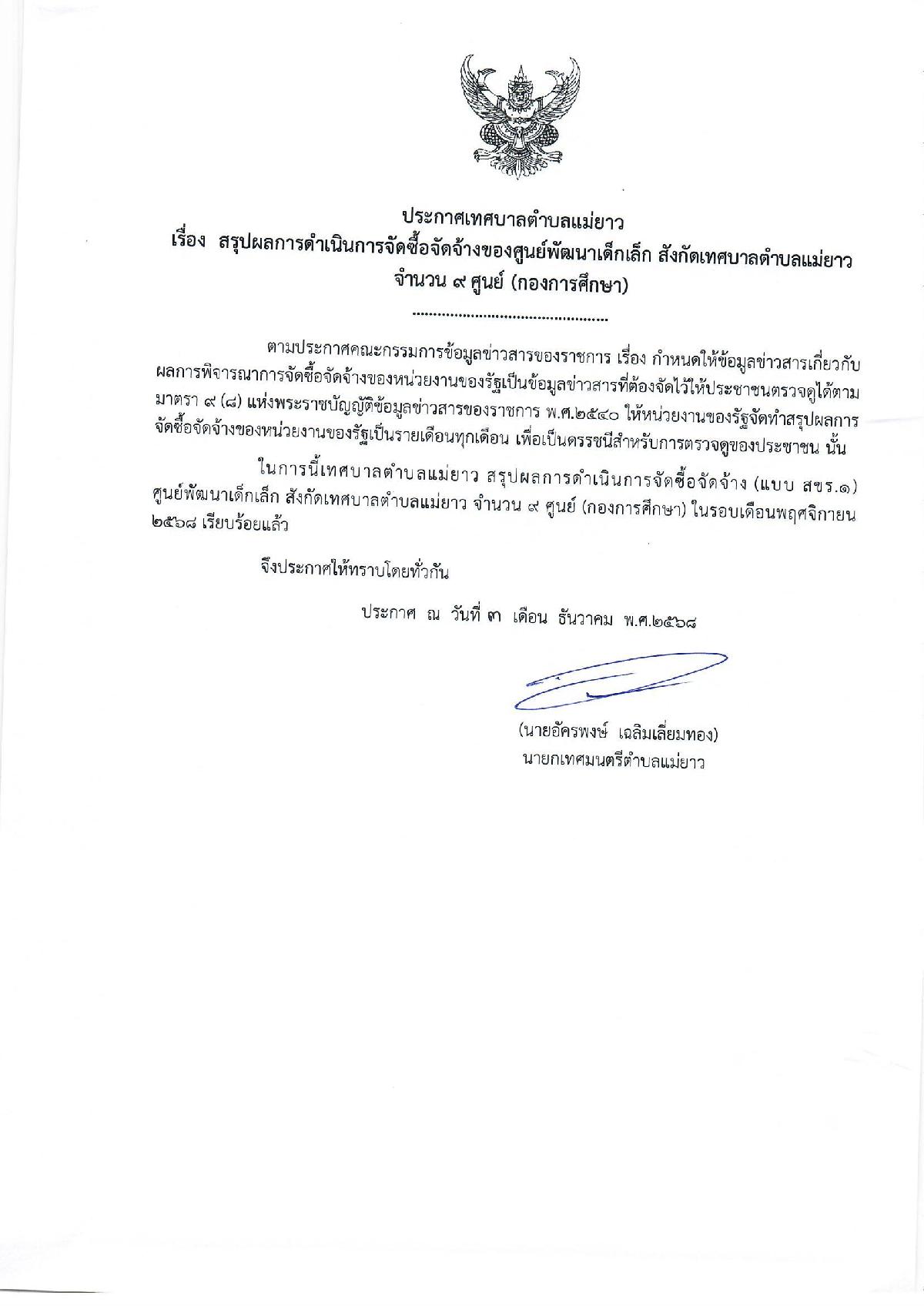 สรุปผลการจัดซื้อจัดจ้างของศูนย์พัฒนาเด็กเล็ก สังกัดกองการศึกษา ประจำเดือนพฤศจิกายน 2568