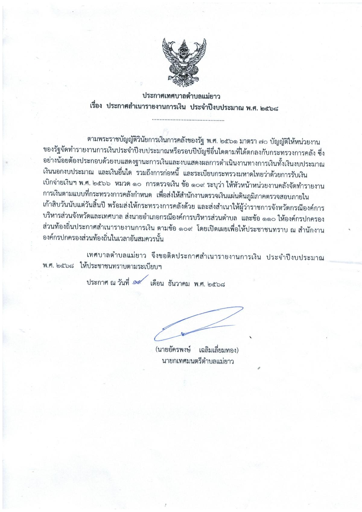 ประกาศเทศบาลตำบลแม่ยาว เรื่อง ประกาศสำเนารายงานการเงิน ประจำปีงบประมาณ พ.ศ.2568