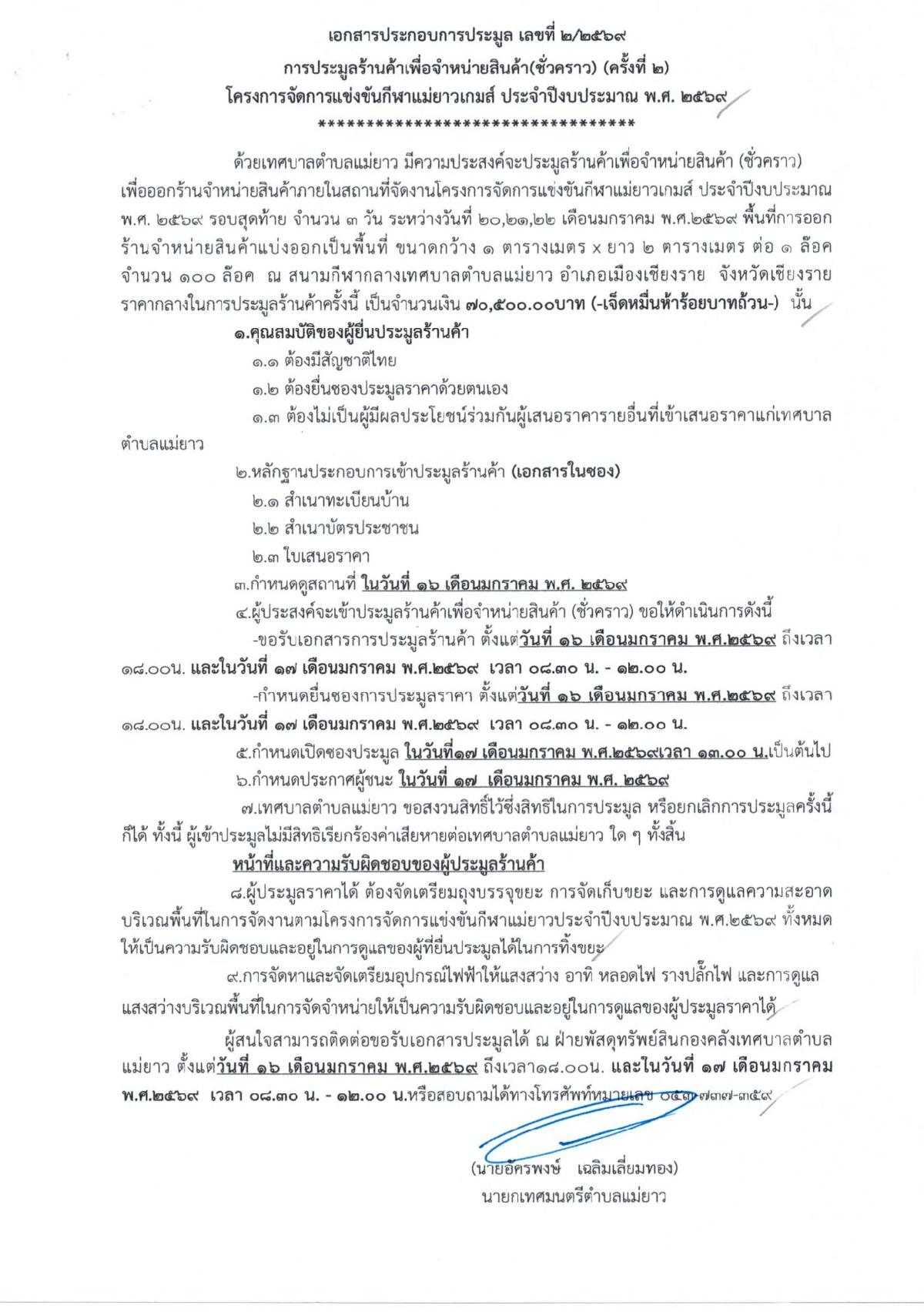 ประกาศเทศบาลตำบลแม่ยาว เรื่อง ประกาศประมูลร้านค้าเพื่อจำหน่ายร้านค้า (ชั่วคราว)(ครั้งที่2) โครงการจัดการแข่งขันกีฬาแม่ยาวเกมส์ ประจำปีงบประมาณ พ.ศ.2569