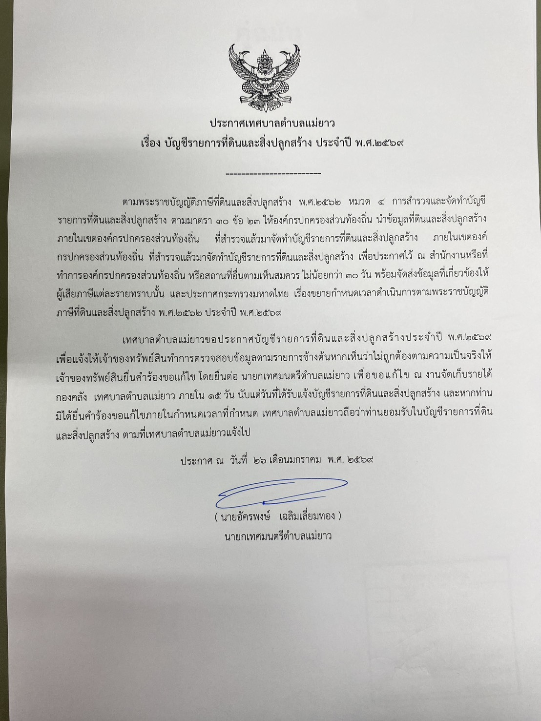 เรื่อง บัญชีรายการที่ดินและสิ่งปลูกสร้าง ประจำปี พ.ศ.2569