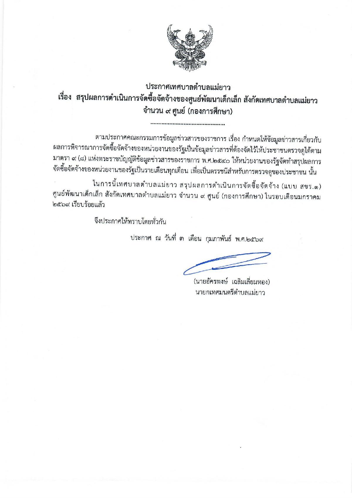 สรุปผลการจัดซื้อจัดจ้างของศูนย์พัฒนาเด็กเล็ก สังกัดเทศบาลตำบลแม่ยาว จำนวน 9 ศูนย์ ประจำเดือนมกราคม 2569