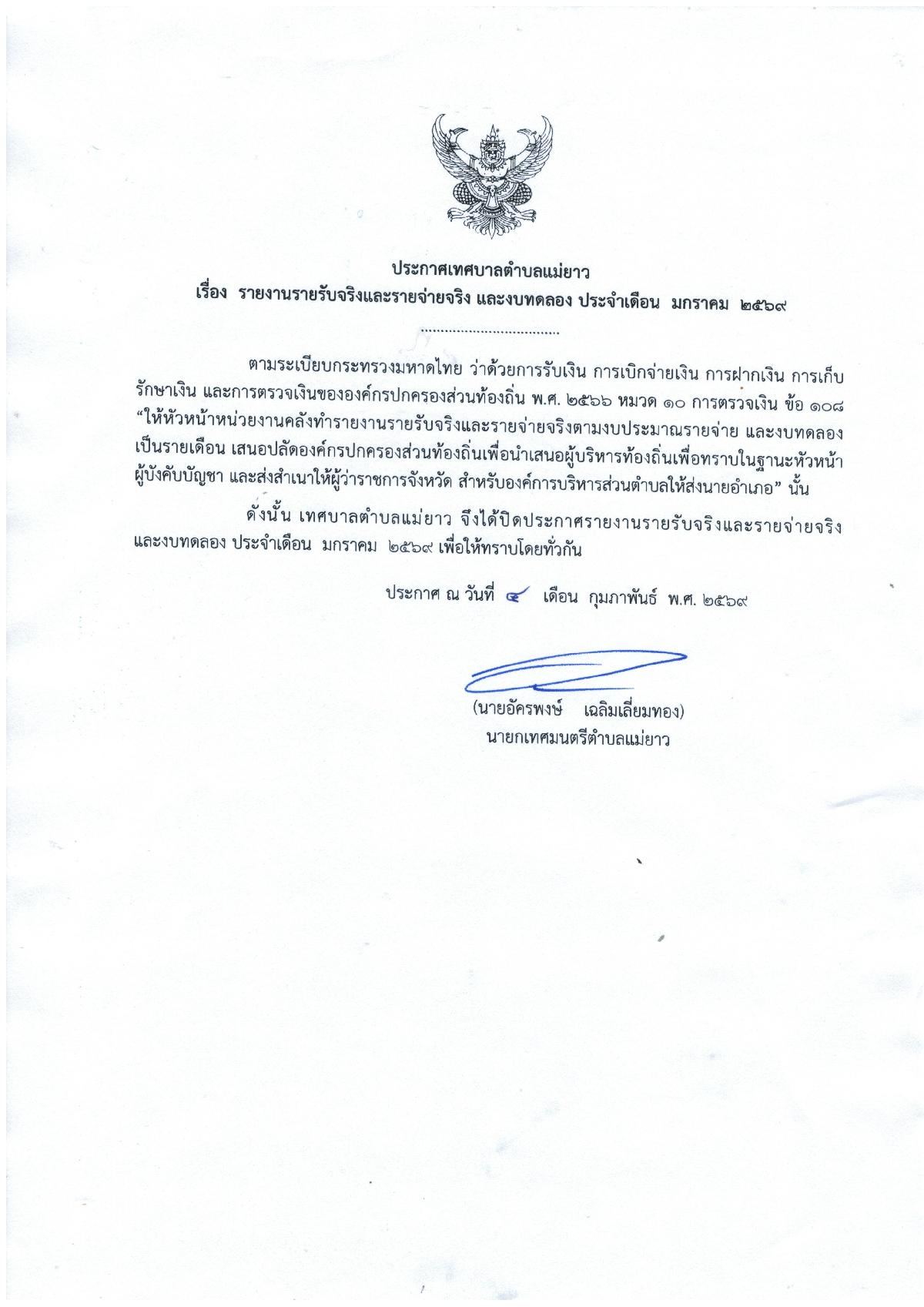 ประกาศเทศบาลตำบลแม่ยาว เรื่อง รายงานรายรับจริงและรายจ่ายจริง และงบทดลอง ประจำเดือนมกราคม 2569