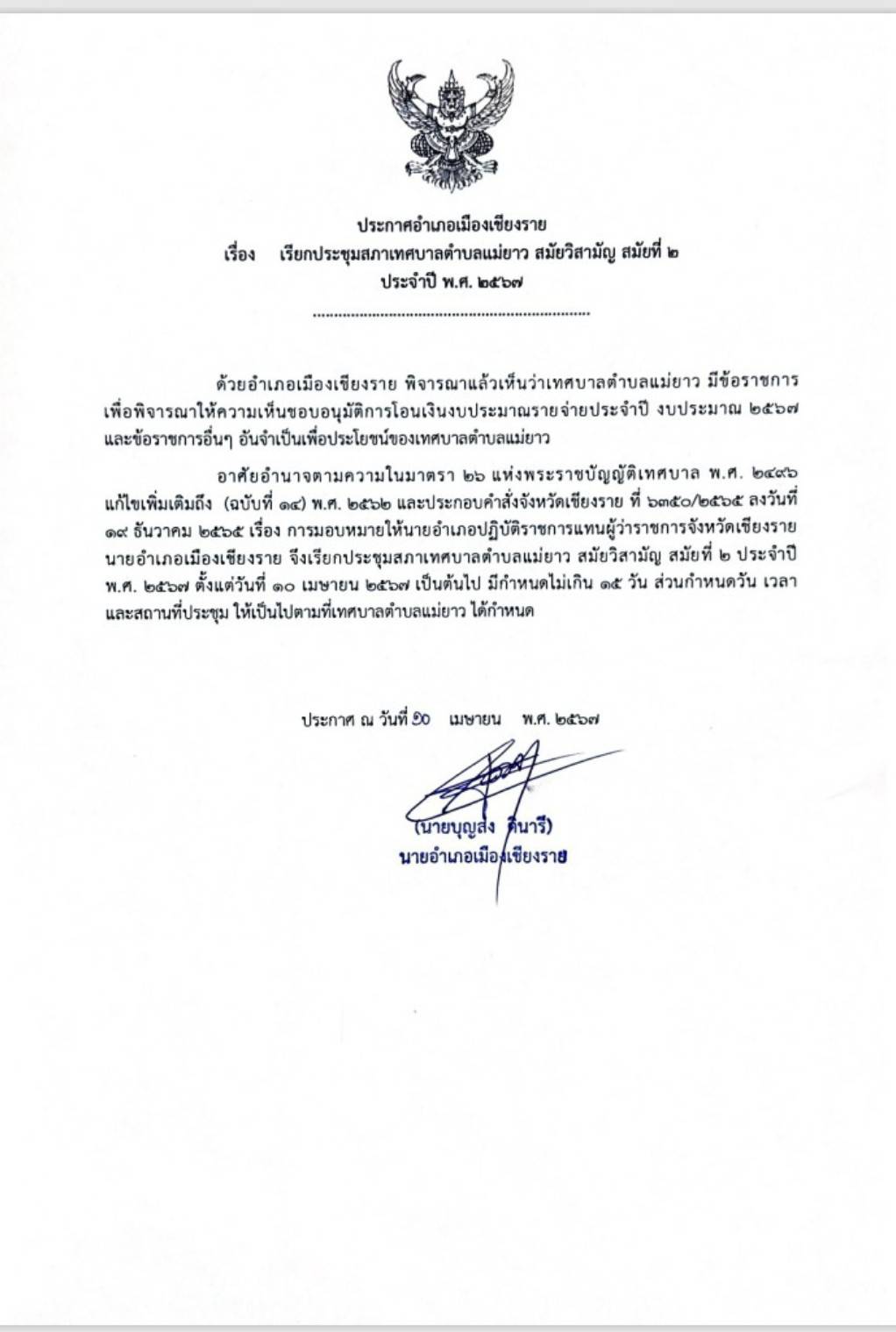 ประกาศอำเภอเมืองเชียงราย เรื่อง เรียกประชุมสภาเทศบาลตำบลแม่ยาว สมัยวิสามัญ สมัยที่ 2 ประจำปี พ.ศ. 2567