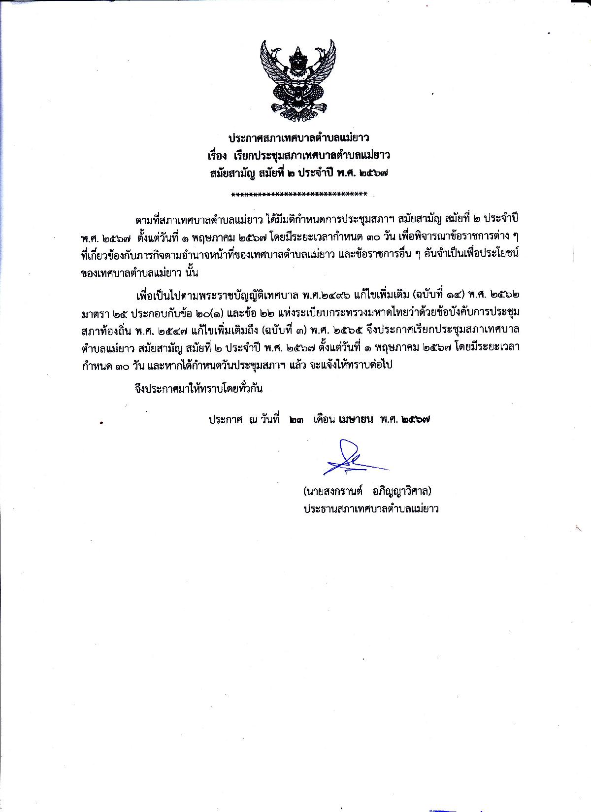 ประกาศสภาเทศบาลตำบลแม่ยา เรื่อง เรียกประชุมสภาเทศบาลตำบลแม่ยาว สมัยสามัญ สมัยที่ 2 ประจำปี พ.ศ. 2567