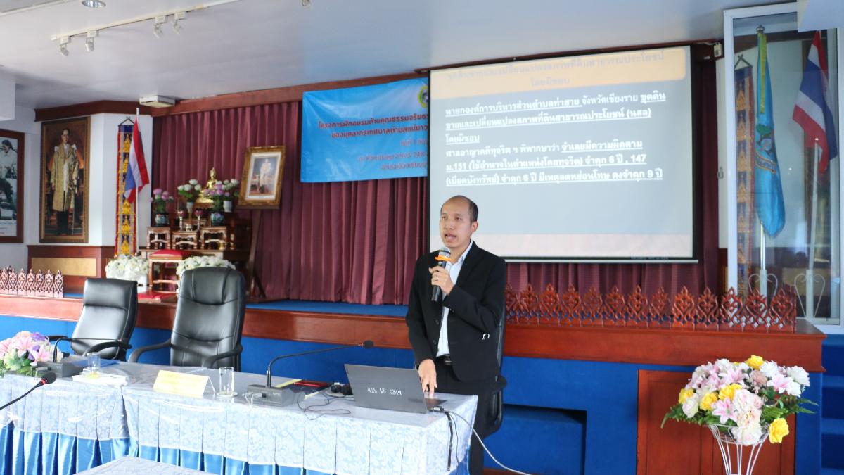 • ช่วงเช้า เป็นการอบรมในหัวข้อเรื่อง “กฎหมายการป้องกันและปราบปรามการทุจริตและปัญหาผลประโยชน์ทับซ้อน การพัฒนาการปฏิบัติงานฯ และความโปร่งใสของหน่วยงานภาครัฐ” โดย สำนักงานป้องกันและปราบปรามการทุจริตแห่งชาติ ประจำจังหวัดเชียงราย