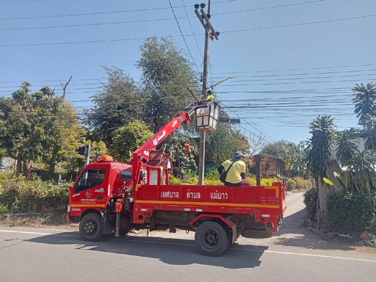 นายอภิรักษ์ อินต๊ะวัง นายกเทศมนตรีตำบลแม่ยาว มอบหมายกองช่าง นำรถกระเช้าออกซ่อมแซมไฟกิ่ง ตามที่ได้รับแจ้ง ผลการปฏิบัติงานซ่อมแซม ไฟกิ่ง สามารถใช้งานได้ตามปกติ