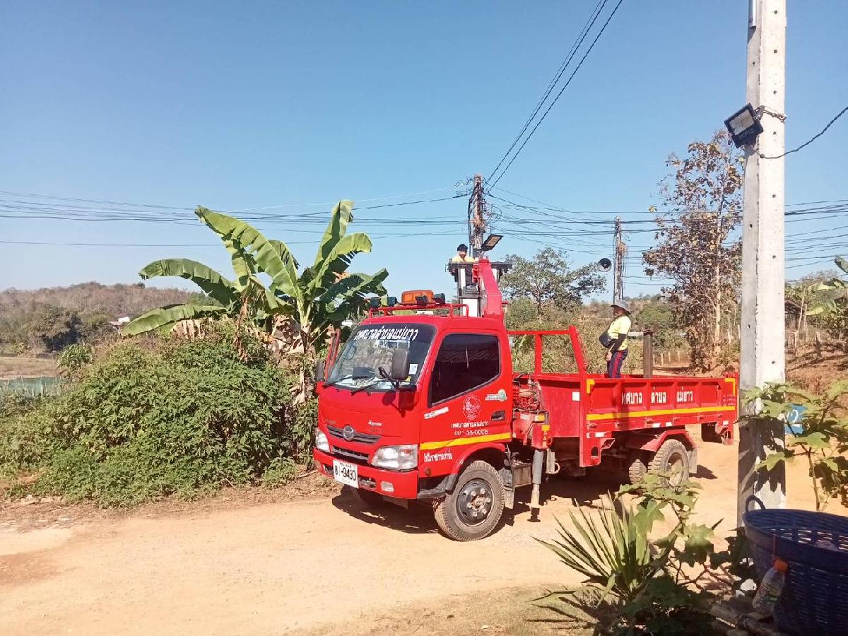 เจ้าหน้าที่กองช่าง นำรถกระเช้าออกซ่อมแซมไฟกิ่ง ณ บ้านสันเจริญ หมู่บ้านบริวารบ้านดงเจริญ ม.17 และบ้านทุ่งหลวง ม.9