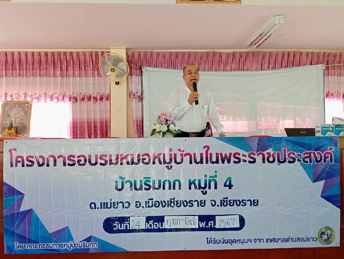 นายอภิรักษ์ อินต๊ะวัง นายกเทศมนตรีตำบลแม่ยาว และเจ้าหน้าที่พนักงานกองสาธารณสุขและสิ่งแวดล้อม ร่วมเปิดโครงการหมอหมู่บ้านในพระราชประสงค์บ้านริมกก ณ หอประชุมหมู่บ้านริมกก ม.4