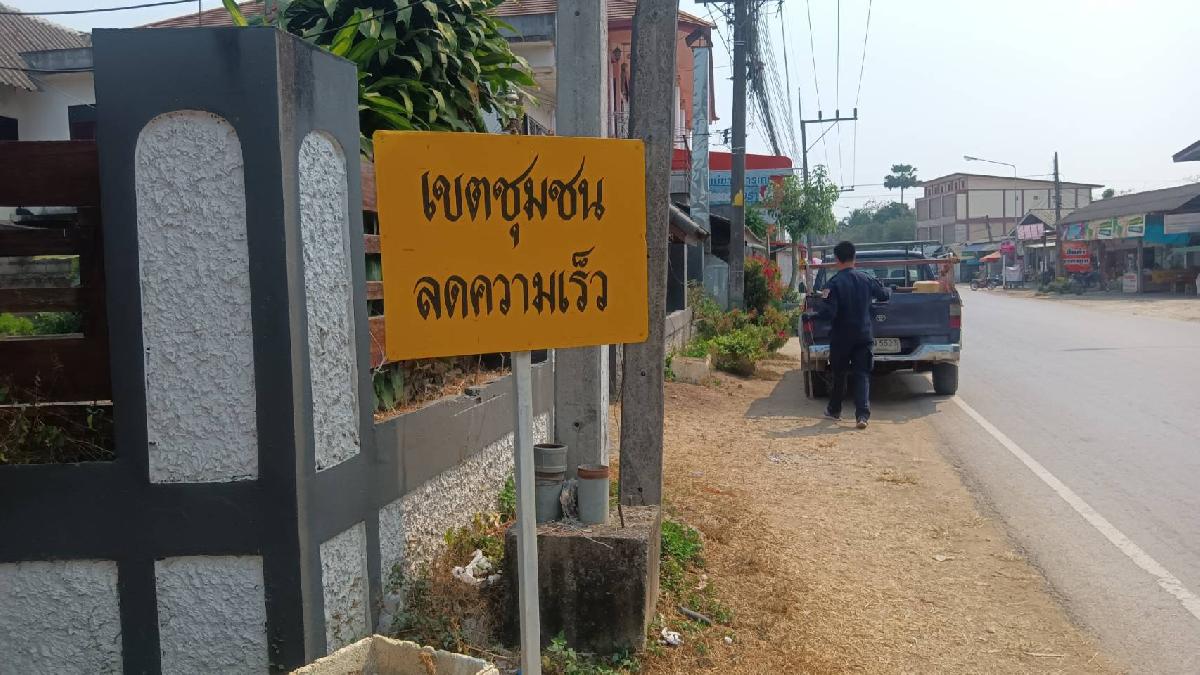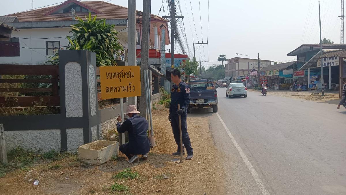 งานป้องกันฯ ติดตั้งป้ายลดความเร็ว บริเวณตลาดทรายมูล