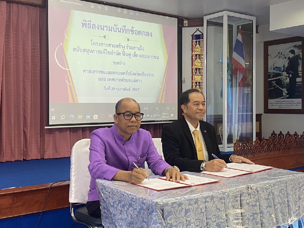 มีนายอภิรักษ์ อินต๊ะวัง นายกเทศมนตรีตำบลแม่ยาว ทีมบริหาร รองปลัดเทศบาลตำบลแม่ยาว ผอ.กองทุกกอง หน.ฝ่ายทุกฝ่าย เจ้าหน้าที่พนักงานเทศบาลตำบลแม่ยาว ผู้ใหญ่บ้าน กลุ่มพัฒนาสตรีตำบลแม่ยาว ร่วมพิธีลงนามบันทึกข้อตกลง ในโครงการศาลสร้าง ร่วมสานใจ สนับสนุนการแก้ไข บำบัด ฟื้นฟู เด็กและเยาวชน ระหว่างเทศบาลตำบลแม่ยาวและศาลเยาวชนและครอบครัวจังหวัดเชียงราย โดยมีนายธเนศ ไชยหมาน ผู้พิพากษาหัวหน้าศาลเยาวชนและครอบครัวจังหวัดเชียงราย เป็นผู้ร่วมลงนาม