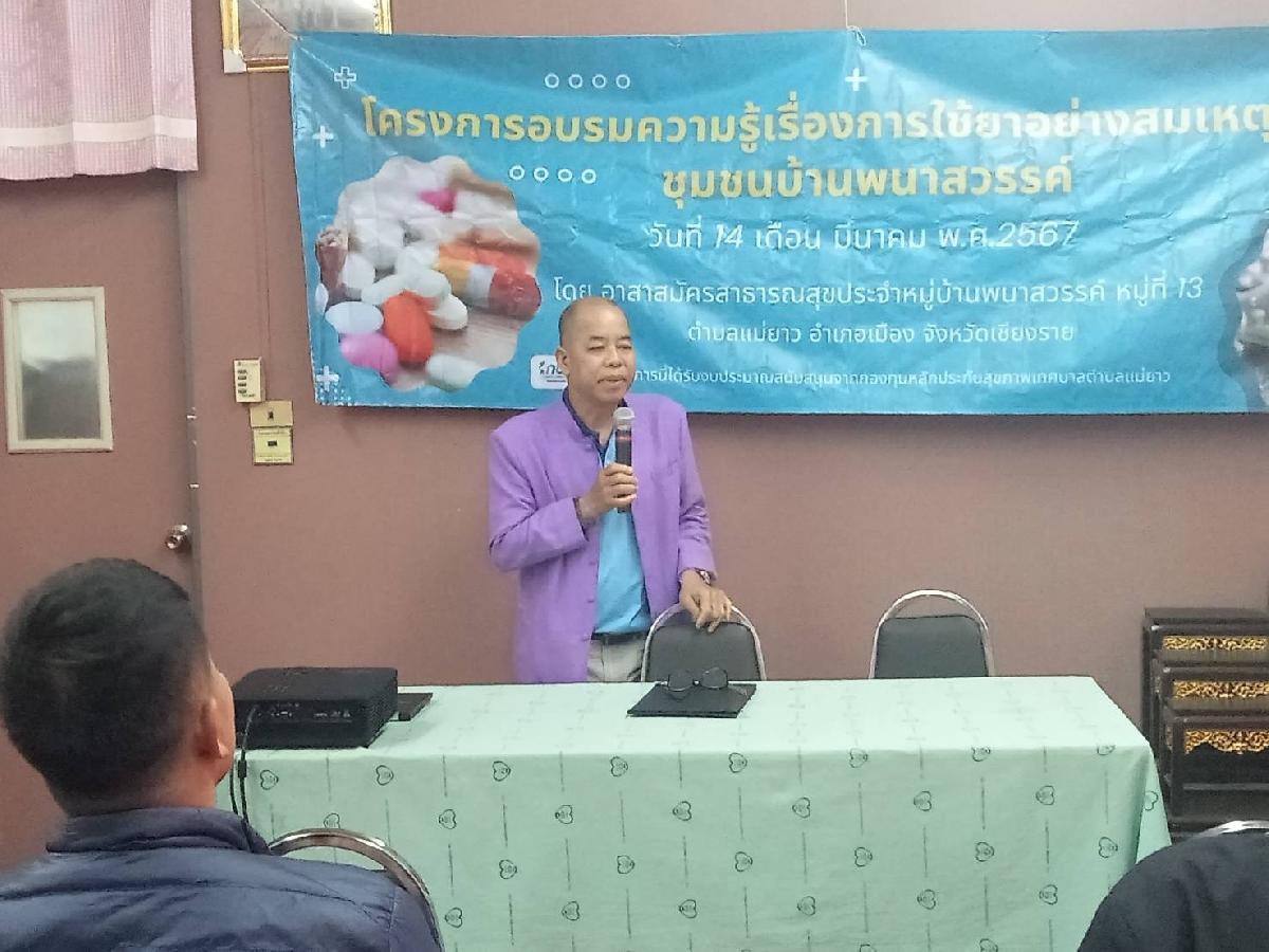 วันพฤหัสบดี ที่ 14 มีนาคม 2567 เวลา 09.00 น. มีนายอภิรักษ์ อินต๊ะวัง นายกเทศมนตรีตำบลแม่ยาว ทีมบริหาร เจ้าหน้าที่กองสาธารณสุขและสิ่งแวดล้อม ร่วมเปิดและติดตามโครงการอบรมความรู้เรื่องการใช้ยาอย่างสมเหตุสมผล ชุมชนบ้านพนาสวรรค์