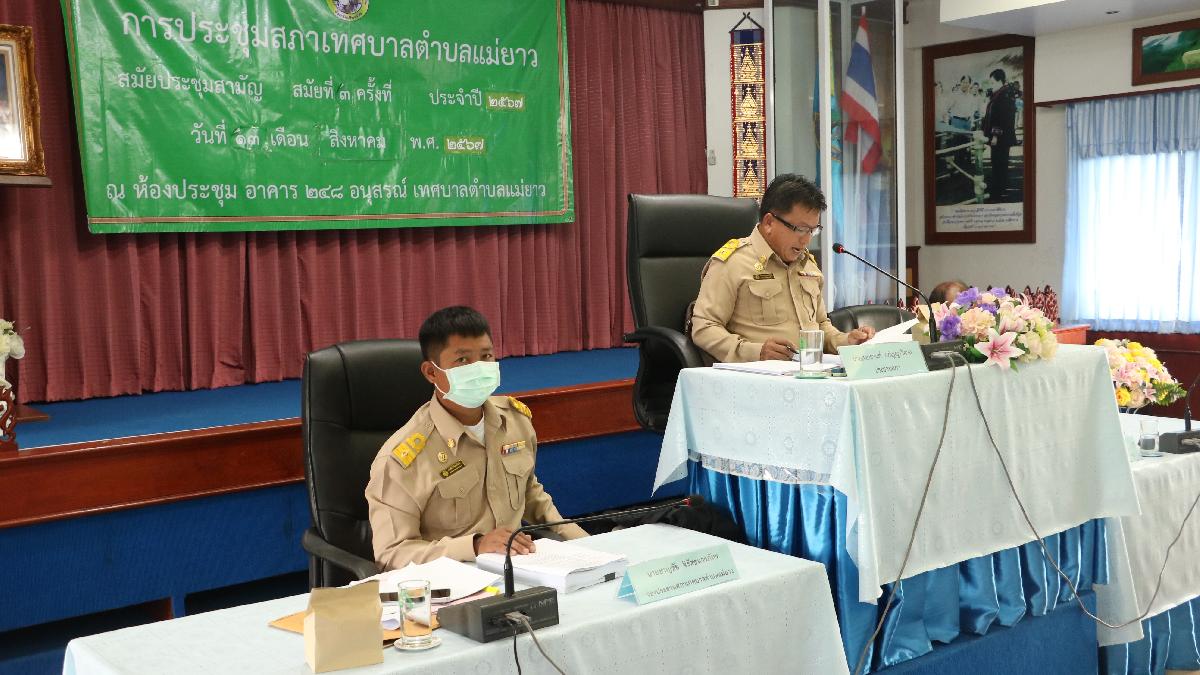 นายอภิรักษ์ อินต๊ะวัง นายกเทศมนตรีตำบลแม่ยาว พร้อมด้วย คณะผู้บริหาร ปลัดเทศบาล รองปลัดเทศบาล หัวหน้าสำนักปลัดเทศบาล ผู้อำนวยการกองทุกกอง และเจ้าหน้าที่ที่เกี่ยวข้อง ประชุมสภาเทศบาลตำบลแม่ยาว สมัยสามัญ สมัยที่ 3 ประจำปี พ.ศ. 2567 ร่วมกับ ประธานสภาเทศบาลฯ รองประธานสภาเทศบาล และสมาชิกสภาเทศบาลตำบลแม่ยาว