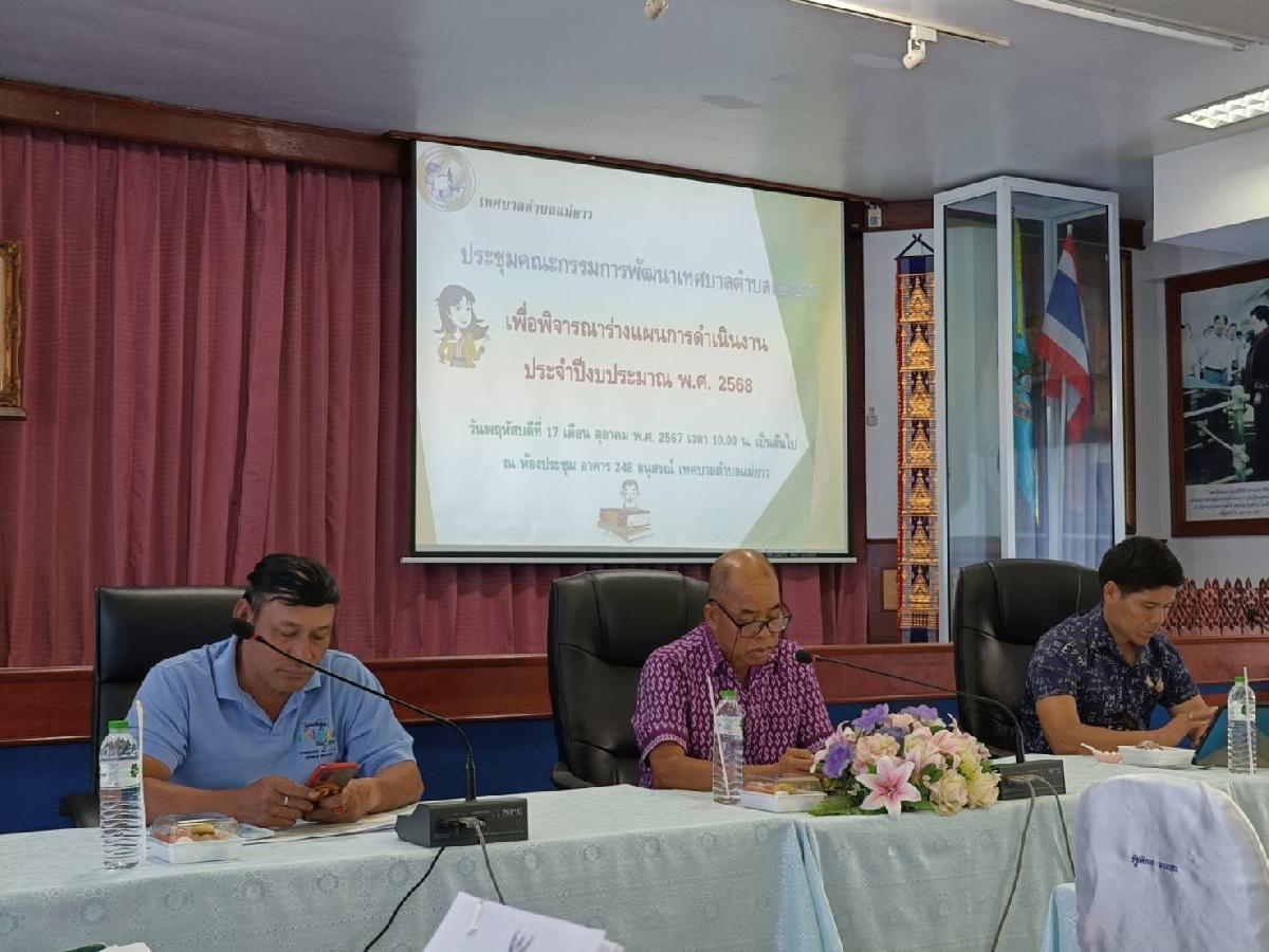 วันพฤหัสบดีที่ 17 ตุลาคม 2567 เวลา 10.00 น. คณะกรรมการพัฒนาเทศบาลตำบลแม่ยาว ประชุมเพื่อพิจารณาร่างแผนการดำเนินงาน ประจำปีงบประมาณ พ.ศ 2568 ณ ห้องประชุม อาคาร 248 อนุสรณ์ เทศบาลตำบลแม่ยาว