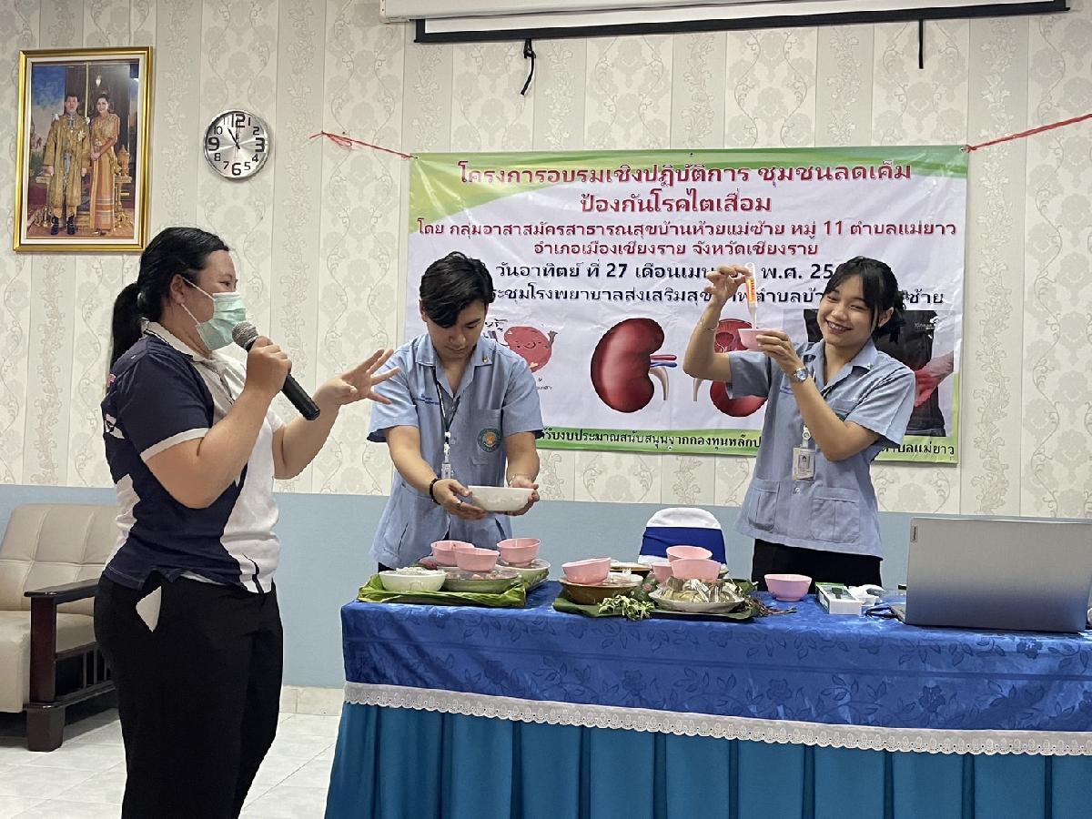วันอาทิตย์ที่ 27 เมษายน 2568 ปลัดศิริรัตน์ สันธิ ปลัดเทศบาล ปฏิบัติหน้าที่นายกเทศมนตรีตำบลแม่ยาว ได้มอบหมายเจ้าหน้าที่ กองสาธารณสุขและสิ่งแวดล้อม เทศบาลตำบลแม่ยาว ติดตามโครงการอบรมเชิงปฏบัติการชุมชนลดเค็ม ป้องกันโรคไตเสื่อม ณ ห้องประชุม โรงพยาบาลส่งเสริมสุขภาพบ้านห้วยแม่ซ้าย