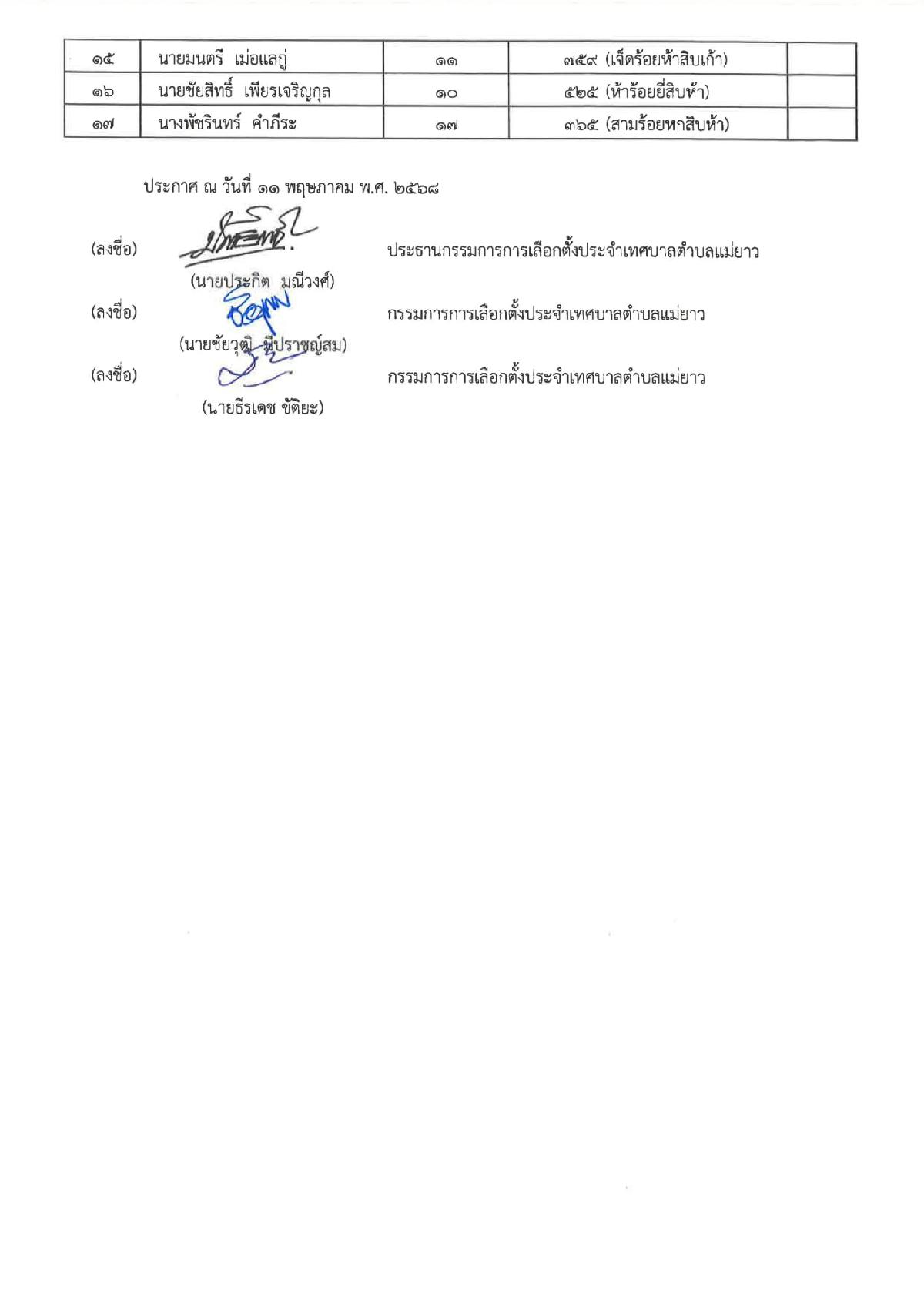 ประกาศคณะกรรมการการเลือกตั้งประจำเทศบาลตำบลแม่ยาวเรื่อง ผลการนับคะแนนเลือกตั้ง (ส.ถ.5/8)สมาชิกสภาเทศบาลตำบลแม่ยาว เขตเลือกตั้งที่ 2
