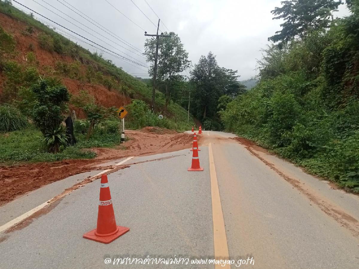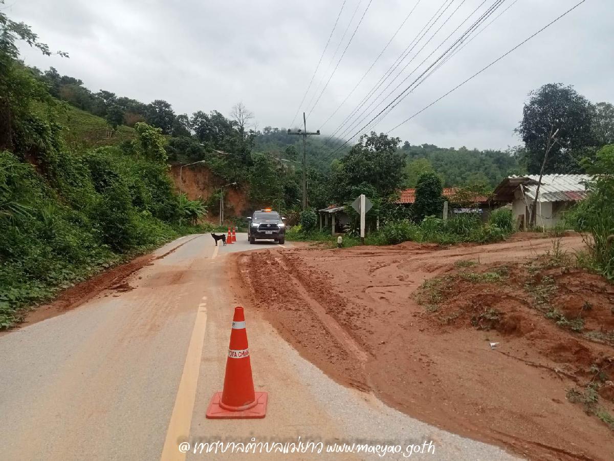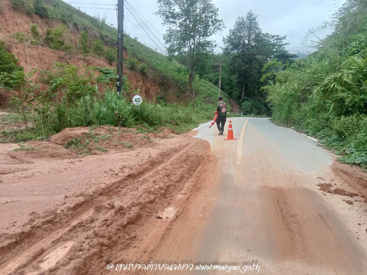 นำกรวยจราจรวางกั้นแนวดินไหลมาที่ถนน เพื่อความปลอดภัยของผู้สัญจร เส้นทางระหว่าง บ้านรวมมิตร - บ้านแคววัวดำ