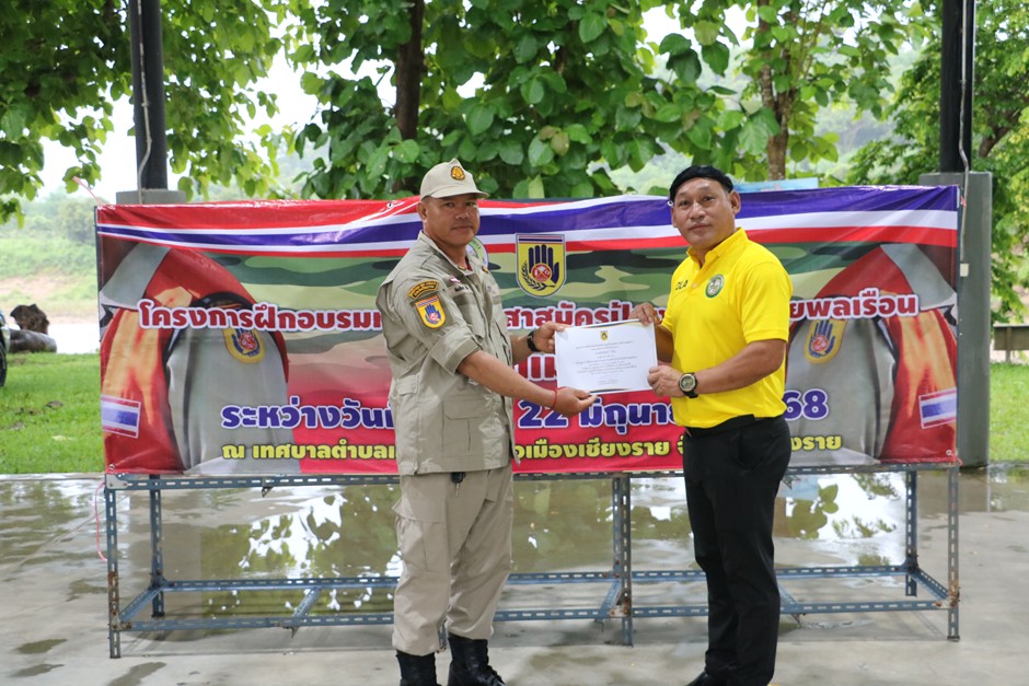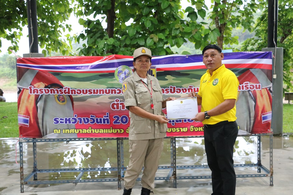 ให้เกียรติมามอบวุฒิบัตรให้กับสมาชิกอาสาสมัครป้องกันภัยฝ่ายพลเรือน (อปพร.) ที่ผ่านการฝึกอบรมทบทวนอาสาสมัครป้องกันภัยฝ่ายพลเรือนตำบลแม่ยาว ระหว่างวันที่ 20 - 22 มิถุนายน 2568 ณ เทศบาลตำบลแม่ยาว