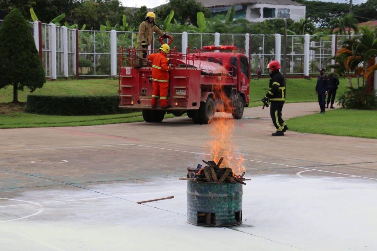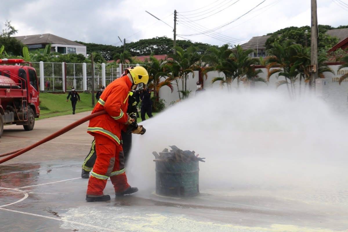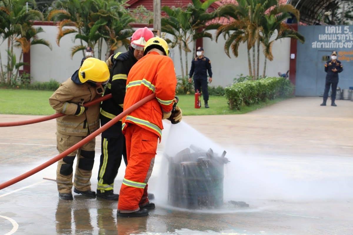 โดยมีเจ้าหน้าที่งานป้องกันฯจำนวน 5 นายพร้อมรถบรรทุกน้ำพร้อมอุปกรณ์ ซ้อมแผนร่วมครั้งนี้