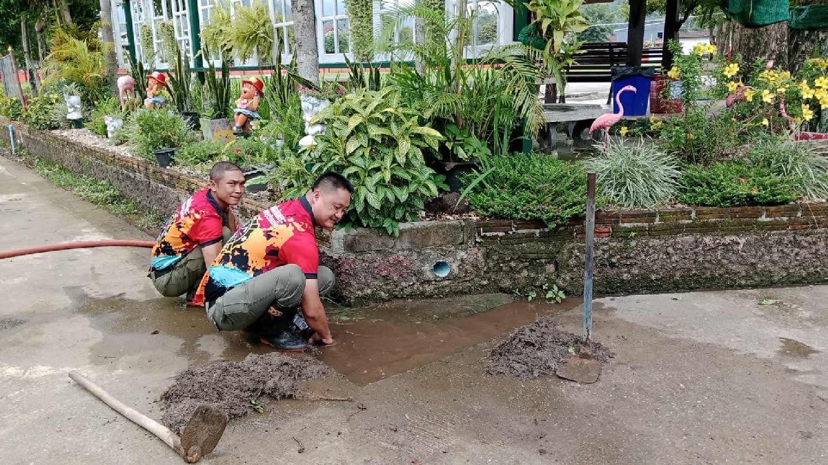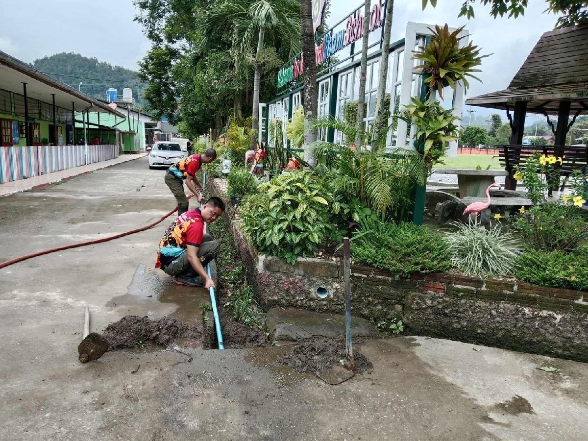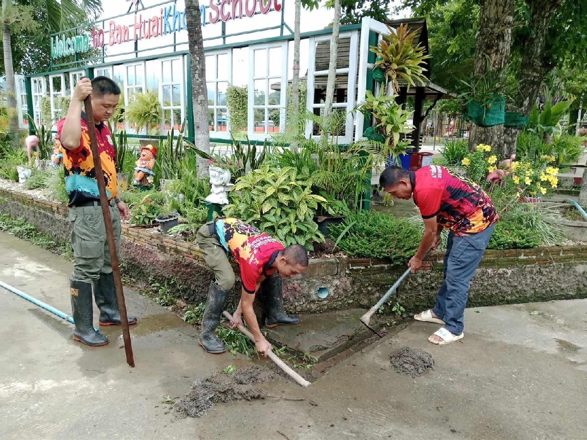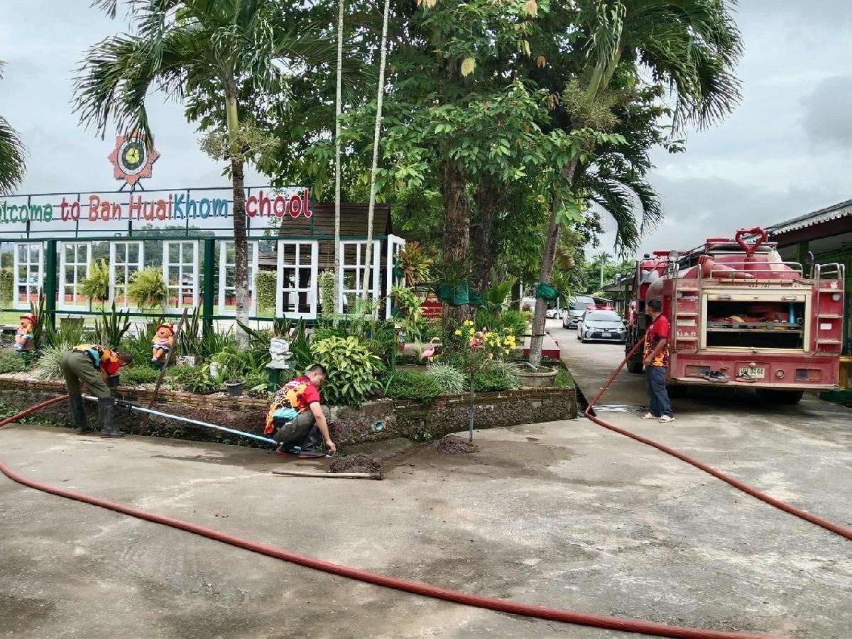งานป้องกันและบรรเทาสาธารณภัย ฝ่ายปกครอง นำรถบรรทุกน้ำ ฉีดลอกท่อระบายน้ำอุดตัน ณ โรงเรียนบ้านห้วยขม หมู่1