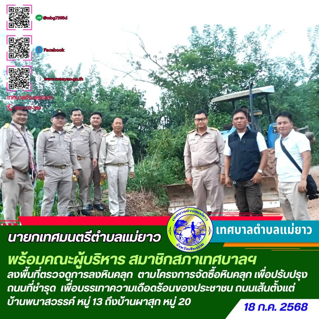 ลงพื้นตรวจดูการลงหินคลุก ตามโครงการจัดซื้อหินคลุก เพื่อปรับปรุงถนนที่ชำรุด ถนนเป็นหลุมเป็นบ่อ ในการแก้ไขปัญหาความเดือดร้อน และเพื่ออำนวยความสะดวกและความปลอดภัยแก่ประชาชนในการสัญจร ภายในตำบลแม่ยาว เขตท