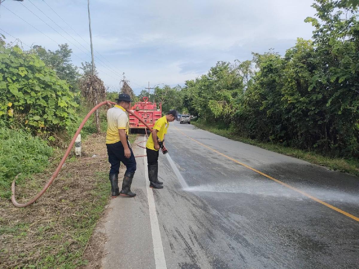 #ออกล้างทำความสะอาดคราบน้ำมันเครื่องบนถนน จากอุบัติเหตุรถชนทำให้น้ำมันใหลเต็มพื้นถนน ซึ่งอาจเป็นอันตรายและอาจทำให้เกิดอุบัติเหตุได้ซ้ำได้ ณ พื้นที่ บ้านท่าหลุก หมู่ที่ 16
