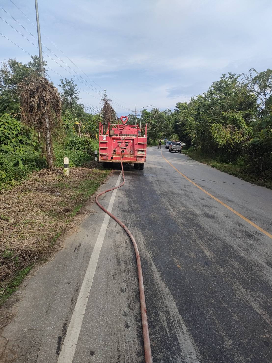 งานป้องกันและบรรเทาสาธารณภัย ฝ่ายปกครอง สำนักปลัดเทศบาล นำรถบรรทุกน้ำเอนกประสงค์ พร้อมเจ้าหน้าที่#ออกล้างทำความสะอาดคราบน้ำมันเครื่องบนถนน บ้านท่าหลุก หมู่ที่ 16