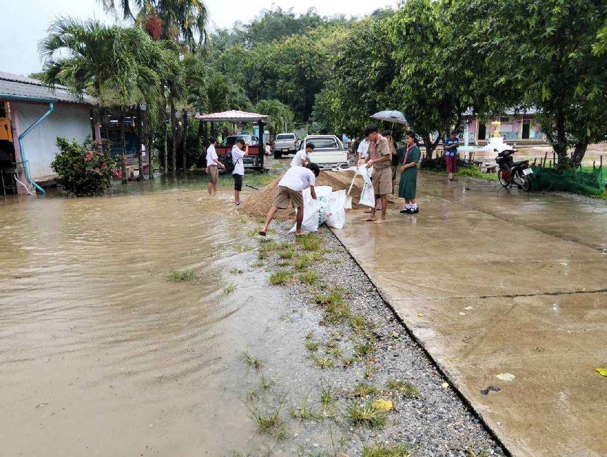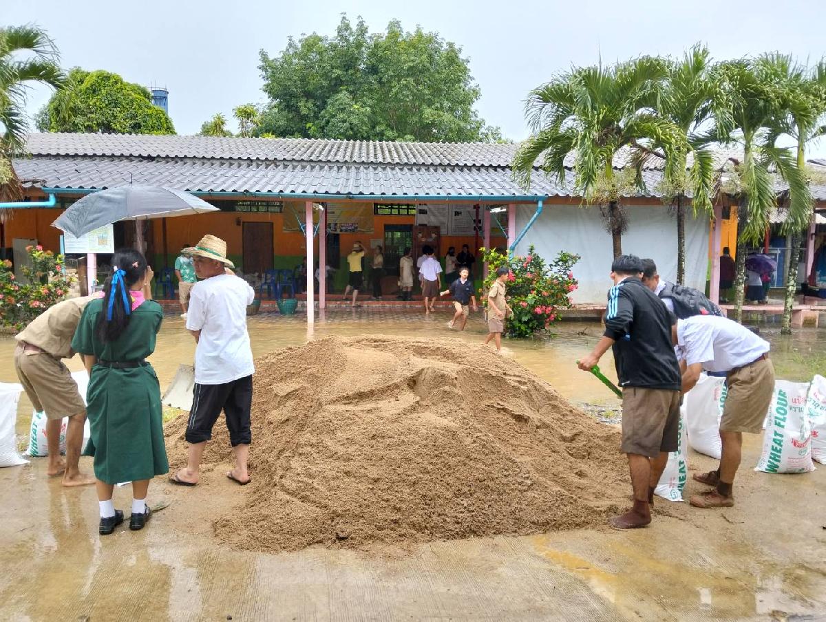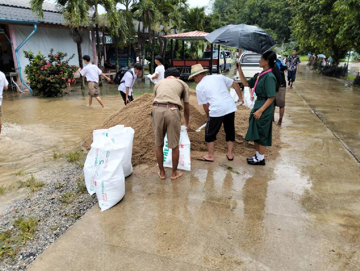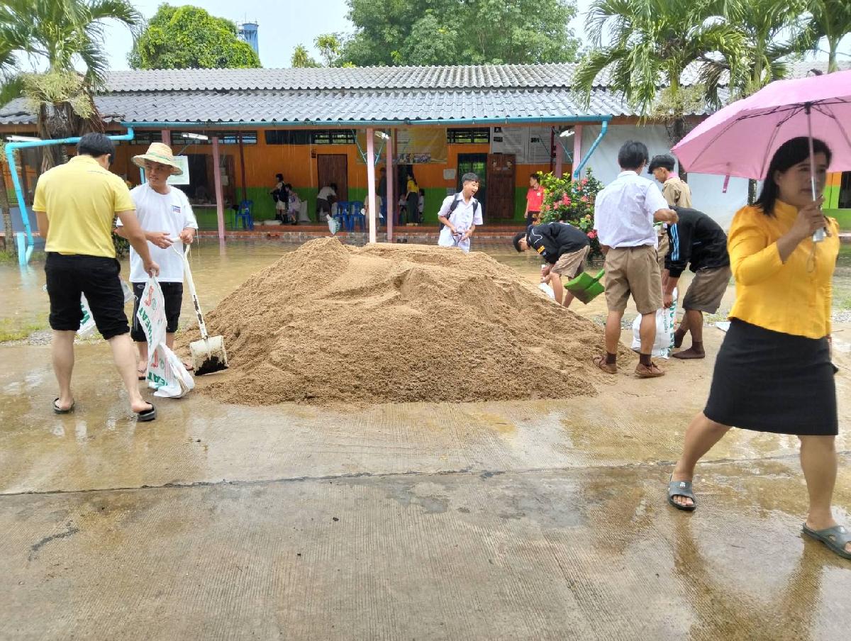 ลงพื้นที่จุดเกิดเหตุ ตรวจสอบและสั่งการให้ดำเนินการจัดซื้อทราย บรรจุกระสอบ เพื่อแก้ไขปัญหาน้ำไหลเข้า โรงเรียนบ้านห้วยทรายขาว หมู่ที่ 3