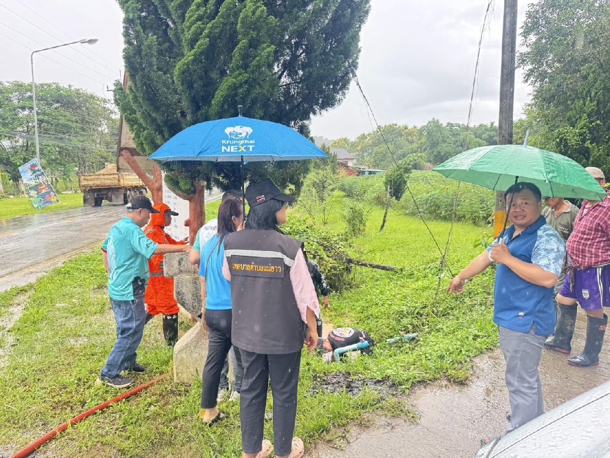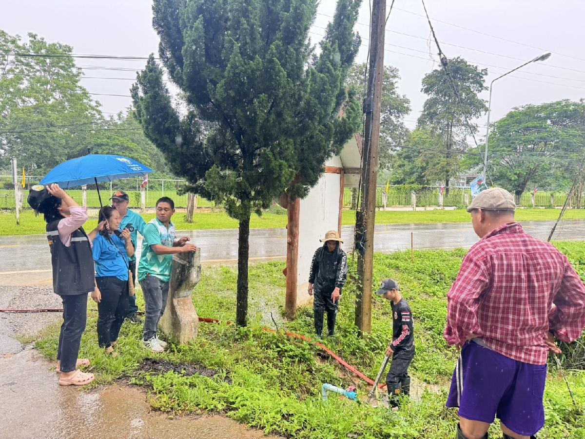 ลงพื้นที่จุดเกิดเหตุ ตรวจสอบ และสั่งการให้นำรถบรรทุกน้ำเอนกประสงค์ ดันท่อระบายน้ำ บ้านห้วยทรายขาว หมู่ 3