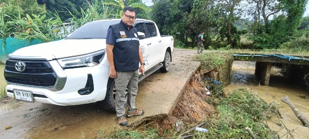 ลงพื้นที่ตรวจสอบ ท่อเหลี่ยม และตลิ่ง ที่ได้รับความเสียหายจากน้ำป่าไหลหลาก บ้านรวมมิตร หมู่ที่ 2