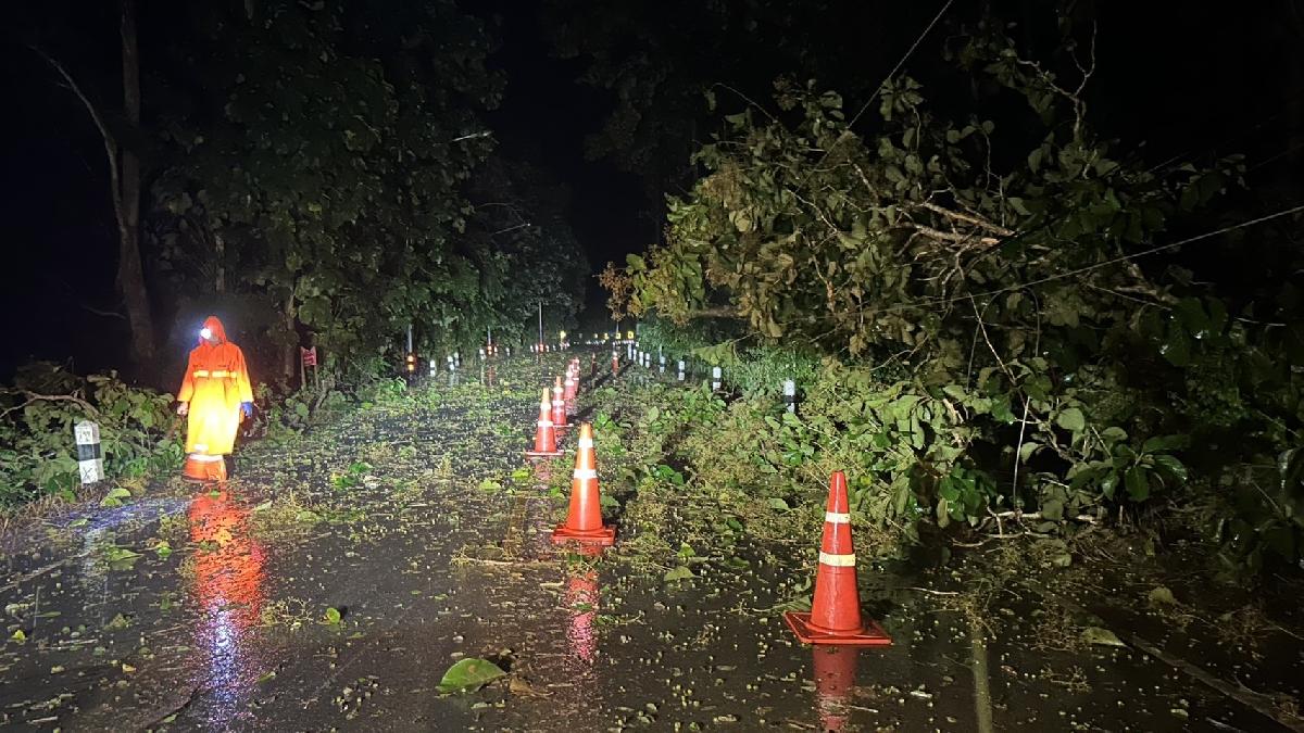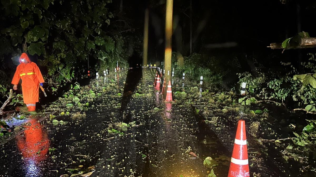 ออกตรวจสอบต้นไม้ล้มกีดขวางทางสัญจรก่อนถึงสามแยกบงแดง บ้านบริวารบ้านห้วยทรายขาว หมู่ 3 ตรวจสอบพบต้นไม้หักทับสายไฟฟ้าขาดเจ้าหน้าที่งานป้องกันจึงทำการตัดเคลียร์เส้นทางบางส่วน เพื่อให้รถสัญจรไปได้และนำกวยจราจรไปตั้งเพื่อป้องกันอุบัติเหตุเนื่องจากไม่สามารถตัดได้ทั้งหมด