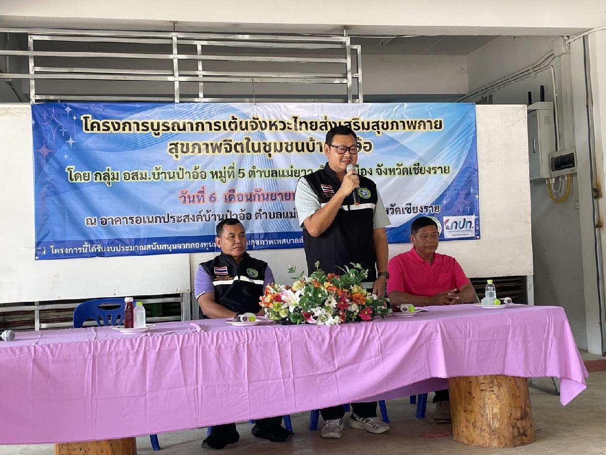 #นายโอฬาร ปัญญาตระกุล และนายมีชัย เผ่าภาณุวัฒน์ รองนายกเทศมนตรีตำบลแม่ยาว เป็นประธานในพิธีเปิดโครงการบูรณาการเต้นจังหวะไทยส่งเสริมสุขภาพกายสุขภาพจิตในชุมชนบ้านป่าอ้อ หมู่ที่ 5