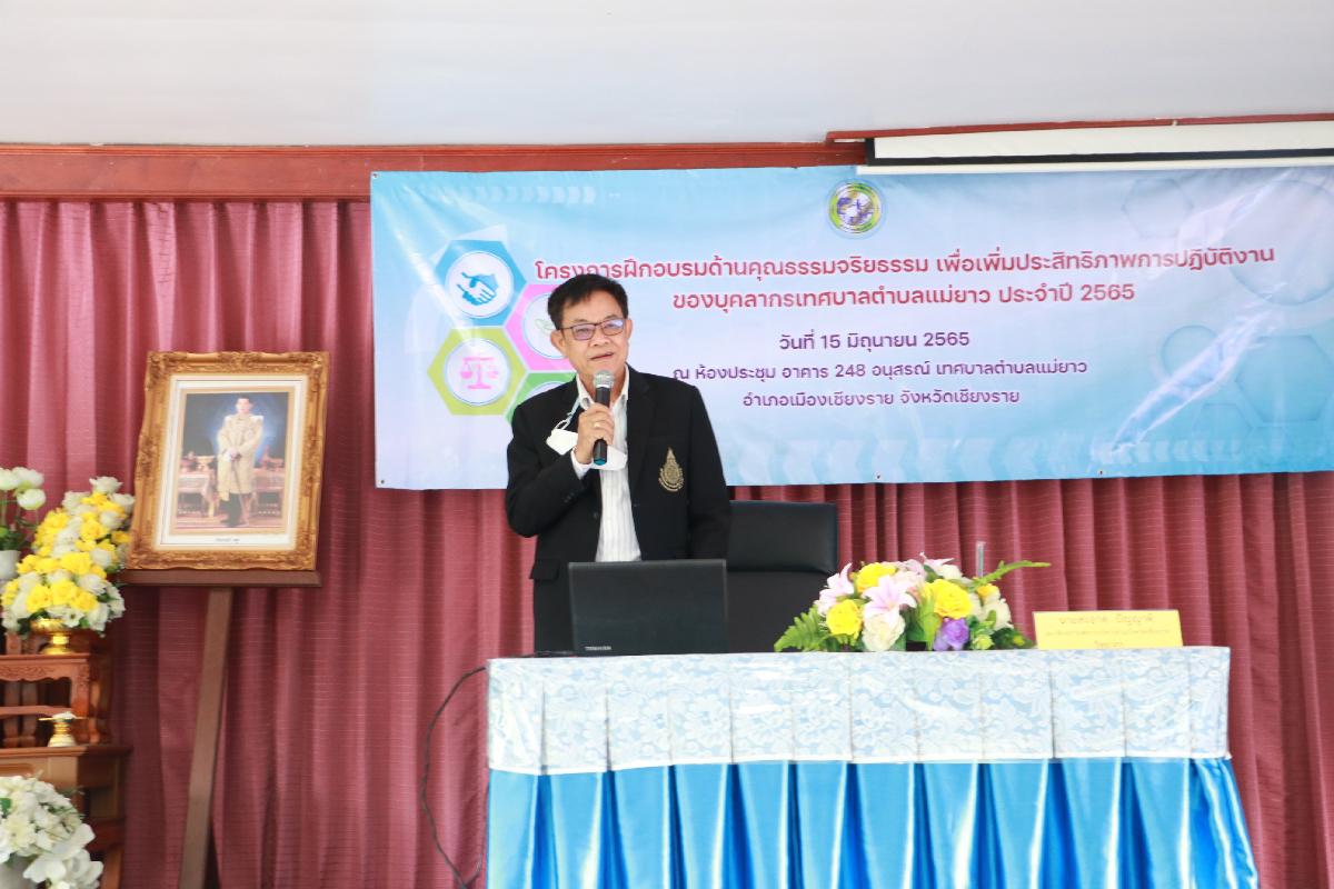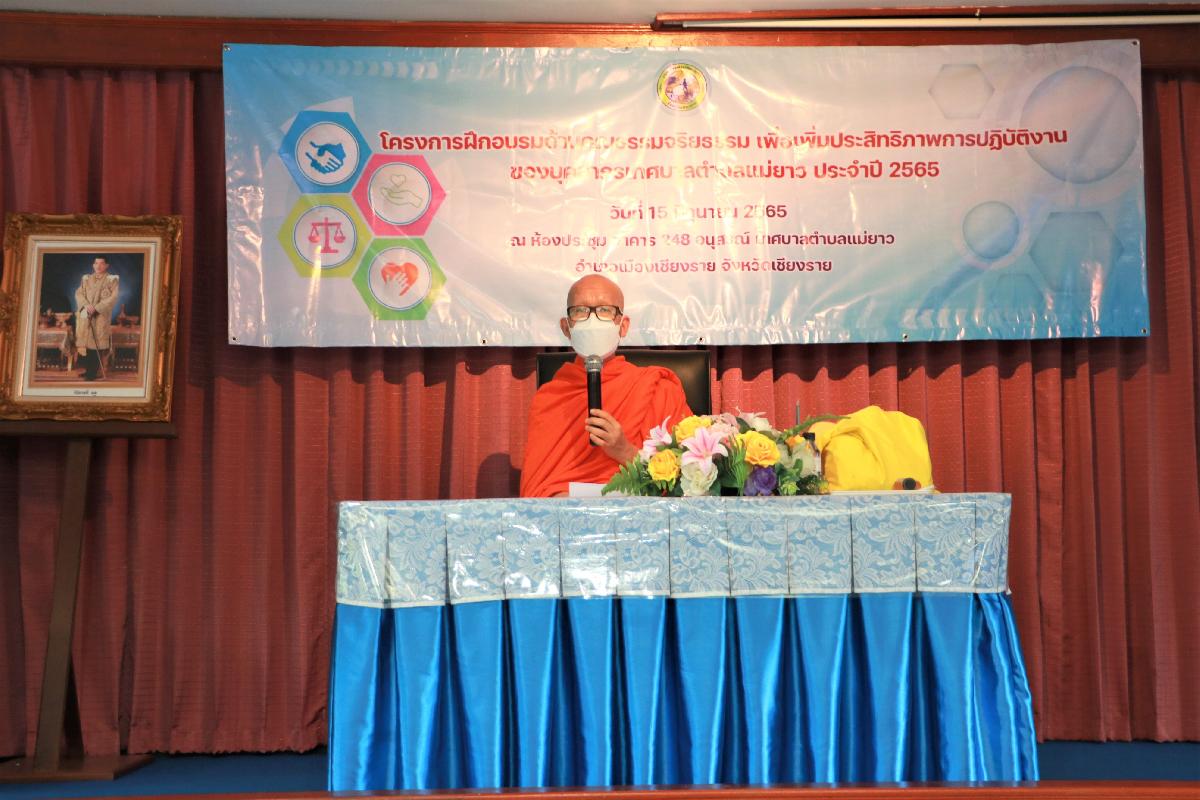 วันพุธ ที่ 15 เดือน มิถุนายน พ.ศ.2565 นายอภิรักษ์ อินต๊ะวัง นายกเทศมนตรีตำบลแม่ยาว พร้อมด้วยทีมบริหาร สมาชิกสภาเทศบาลตำบลแม่ยาว เขต 1, เขต 2 ปลัดเทศบาล รองปลัดเทศบาล หัวหน้าสำนักปลัด ผู้อำนวยการกองทุกกอง หัวหน้าฝ่ายทุกฝ่าย พนักงานเทศบาลตำบลแม่ยาว เข้าร่วมโครงการอบรมด้านคุณธรรม จริยธรรม เพื่อเพิ่มประสิทธิภาพการปฏิบัติงานของบุคลากร ประจำปี 2565 โดยมีพระเดชพระคุณท่านเจ้าคุณ ดร.พระรัตนมุณี อาจารย์สะอาด ปัญญาดี สมาชิกสภาองค์การบริหารส่วนจังหวัดเชียงราย เป็นวิทยากร ในการอบรมครั้งนี้ ณ ห้องประชุมอาคาร 248 อนุสรณ์ เทศบาลตำบลแม่ยาว