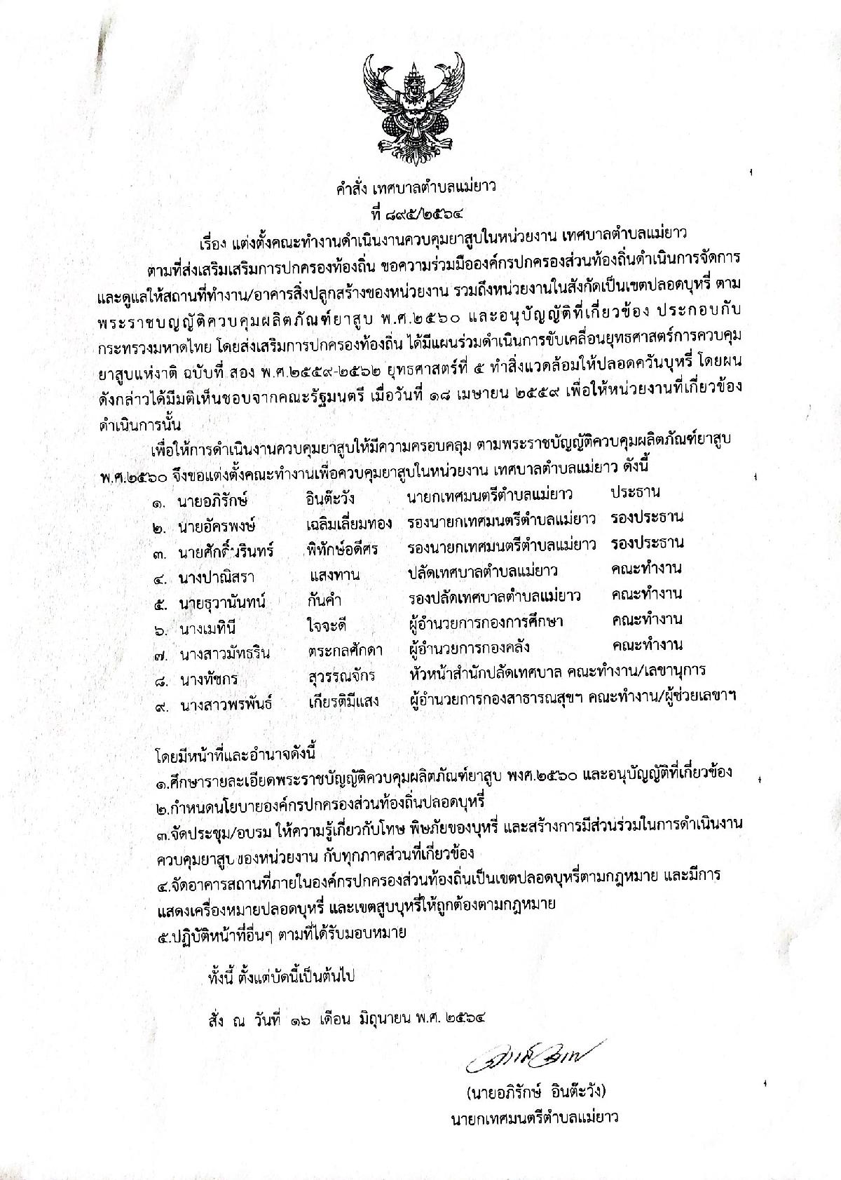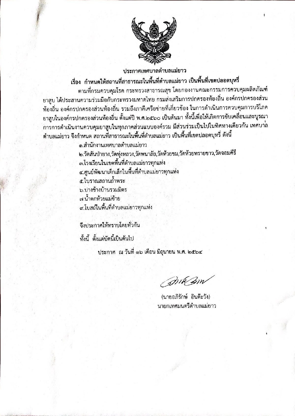 เทศบาลตำบลแม่ยาว ประกาศนโยบายแม่ยาวปลอดบุหรี่ เพื่อดำเนินงานควบคุมยาสูบในพื้นที่ตำบลแม่ยาว ตามนโยบายกระทรวงสาธารณสุข ดังนี้