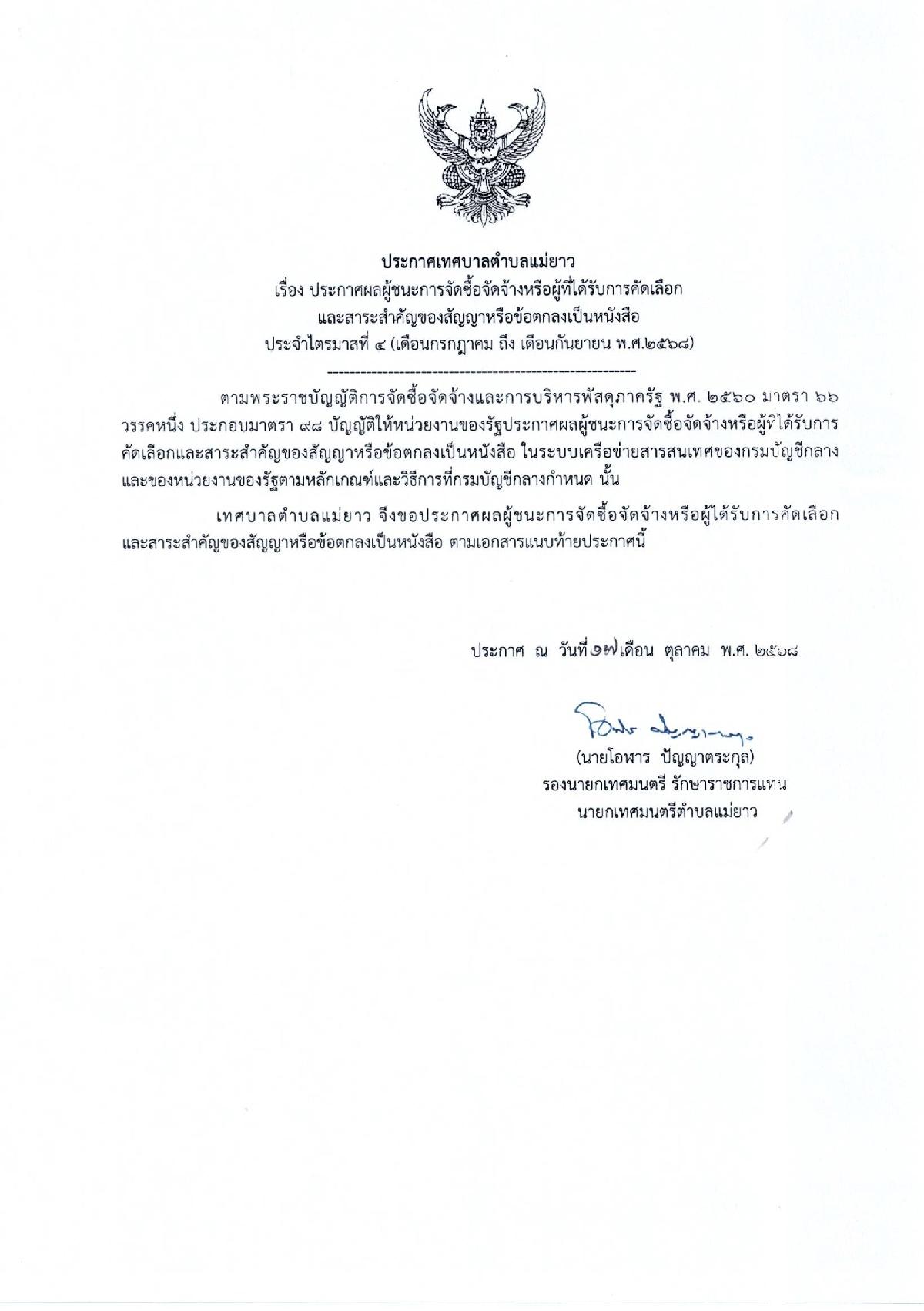 ประกาศผู้ชนะการจัดซื้อจัดจ้างหรือผู้ได้รับการคัดเลือก ตามพรบ.จัดซื้อจัดจ้างฯ2560 มาตรา 66 ประจำไตรมาสที่ 4 (เดือนกรกฎาคมถึง เดือนกันยายน2568)