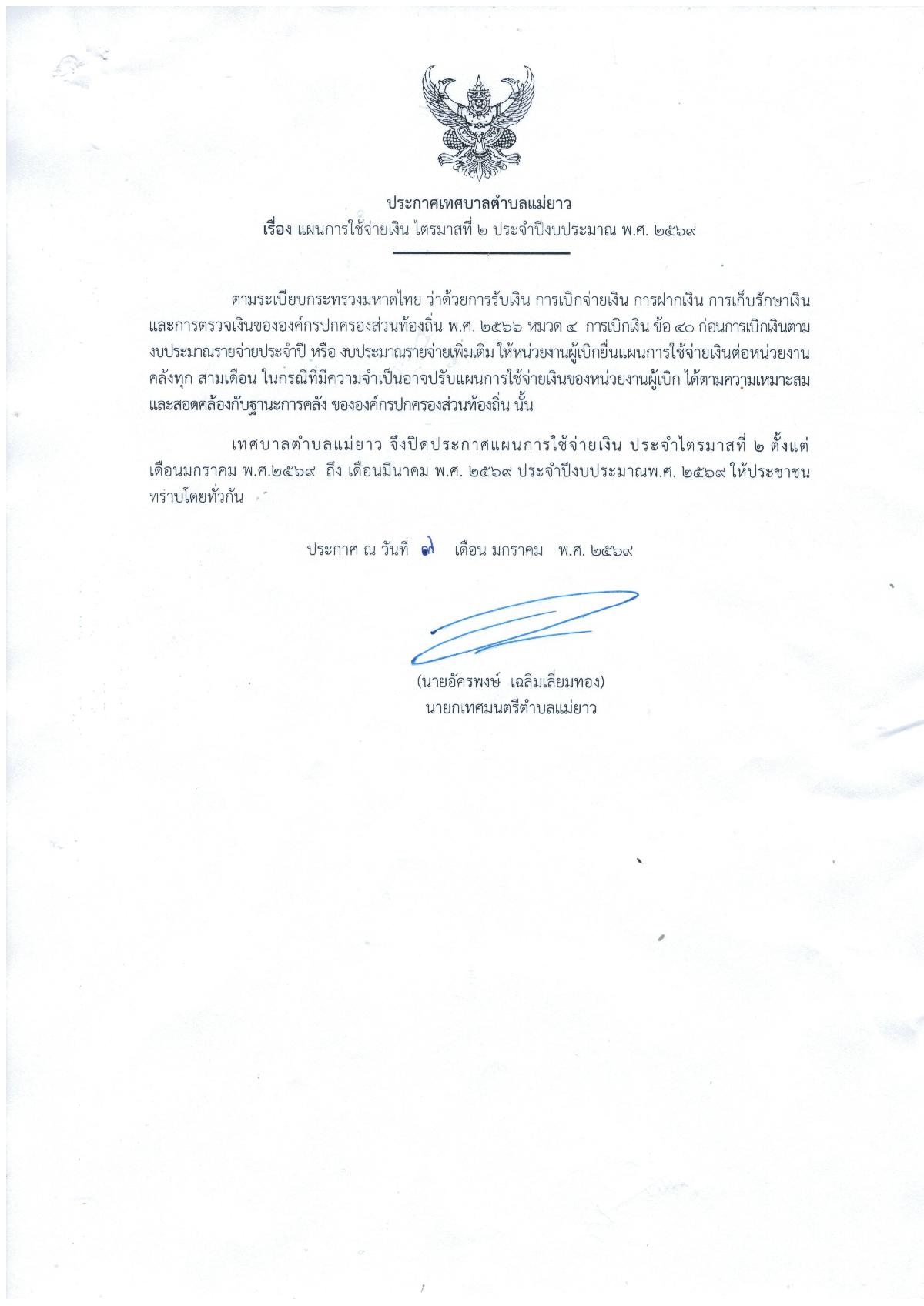 ประกาศเทศบาลตำบลแม่ยาว เรื่อง แผนการใช้จ่ายเงิน ไตรมาสที่ 2 ประจำปีงบประมาณ พ.ศ.2569 โดย กองคลัง เมื่อ 07-01-2569 | อ่าน 35 ครั้ง