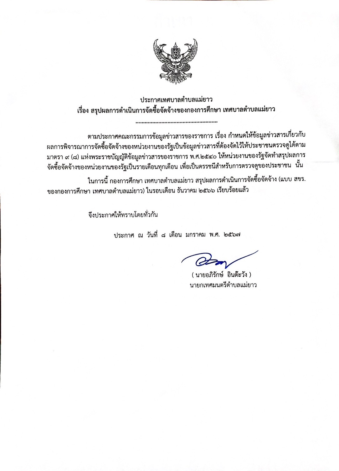 สรุปผลการดำเนินการจัดซื้อจัดจ้าง สขร. (กองการศึกษา) ประจำเดือนธันวาคม 2566