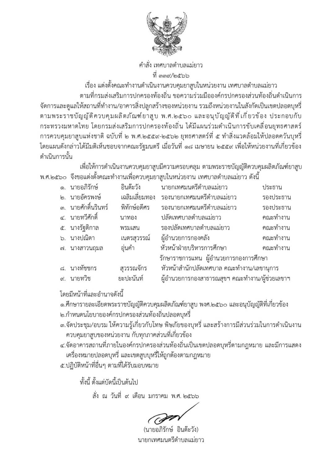 คำสั่ง เทศบาลตำบลแม่ยาว เรื่องแต่งตั่งคณะทำงานดำเนินงานควบคุมยาสูบ