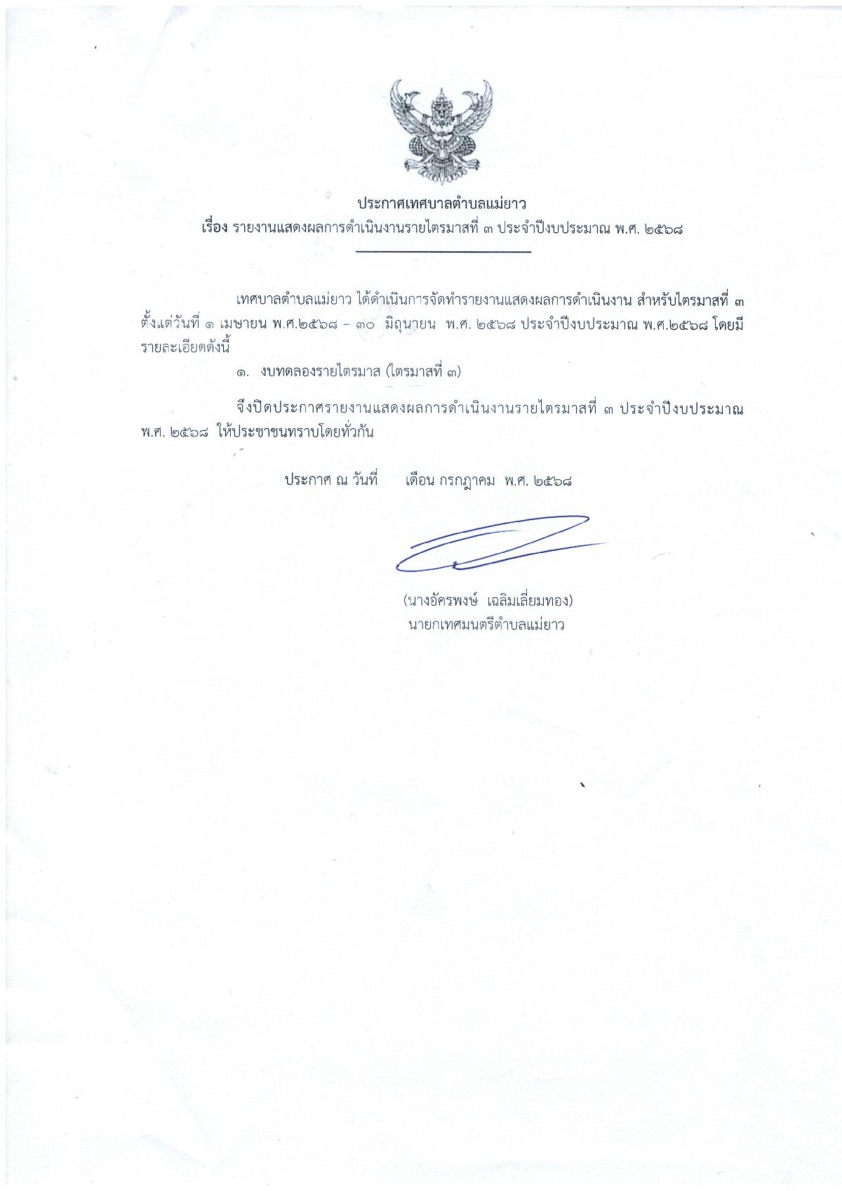 ประกาศเทศบาลตำบลแม่ยาว เรื่อง รายงานแสดงผลการดำเนินงานรายไตรมาสที่ 3 ประจำปีงบประมาณ พ.ศ.2568