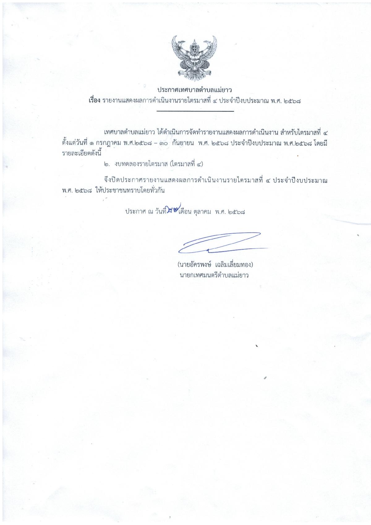 ประกาศเทศบาลตำบลแม่ยาว เรื่อง รายงานแสดงผลการดำเนินงานรายไตรมาสที่ 4 ประจำปีงบประมาณ พ.ศ.2568
