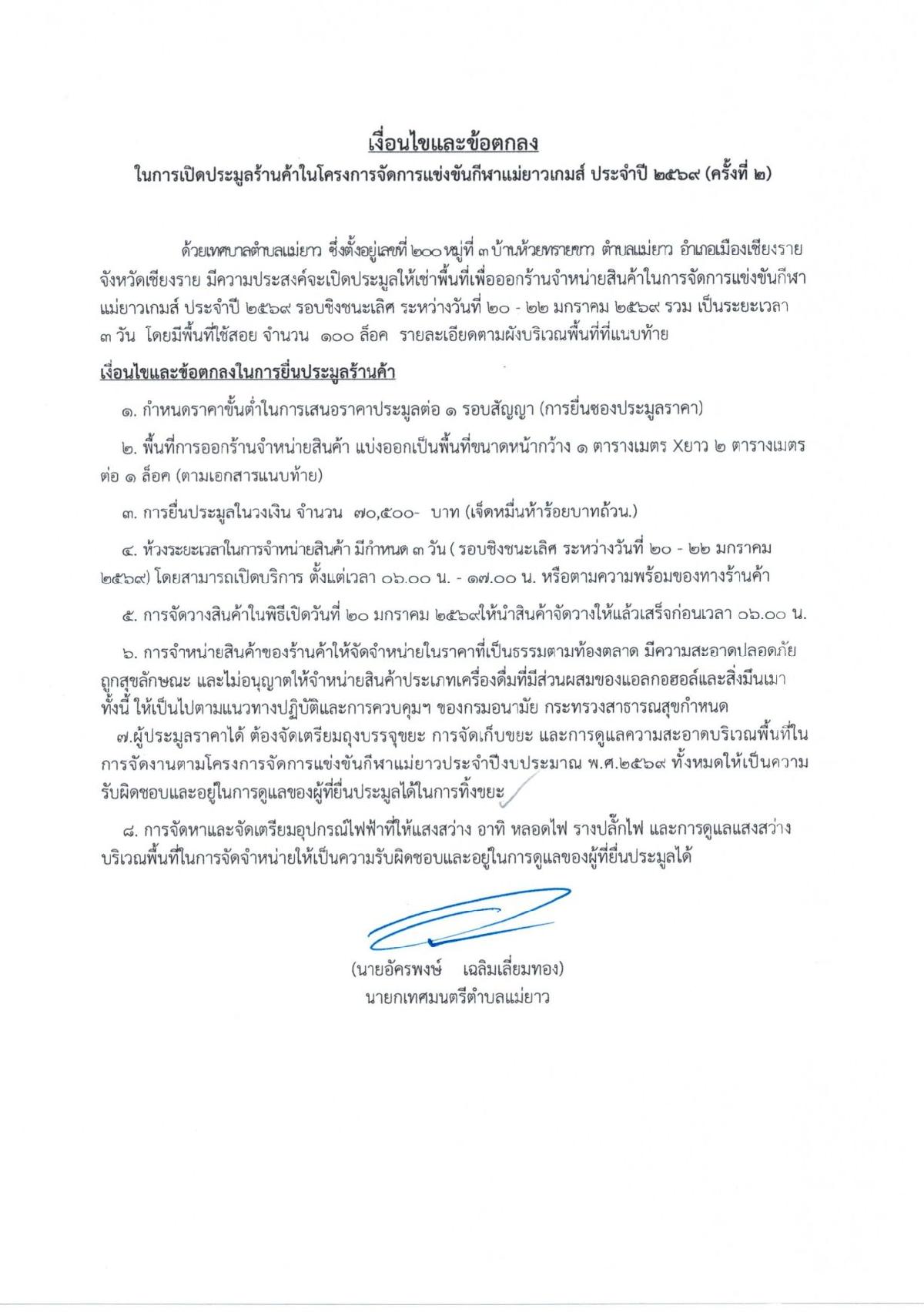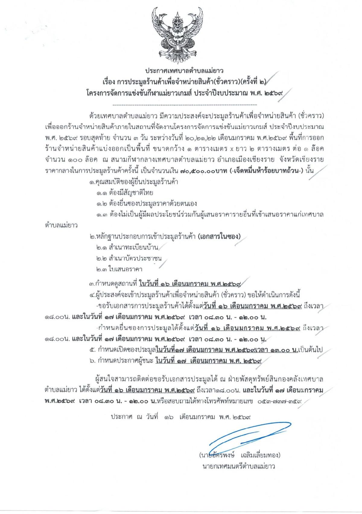 ประกาศเทศบาลตำบลแม่ยาว เรื่อง ประกาศประมูลร้านค้าเพื่อจำหน่ายร้านค้า (ชั่วคราว)(ครั้งที่2) โครงการจัดการแข่งขันกีฬาแม่ยาวเกมส์ ประจำปีงบประมาณ พ.ศ.2569