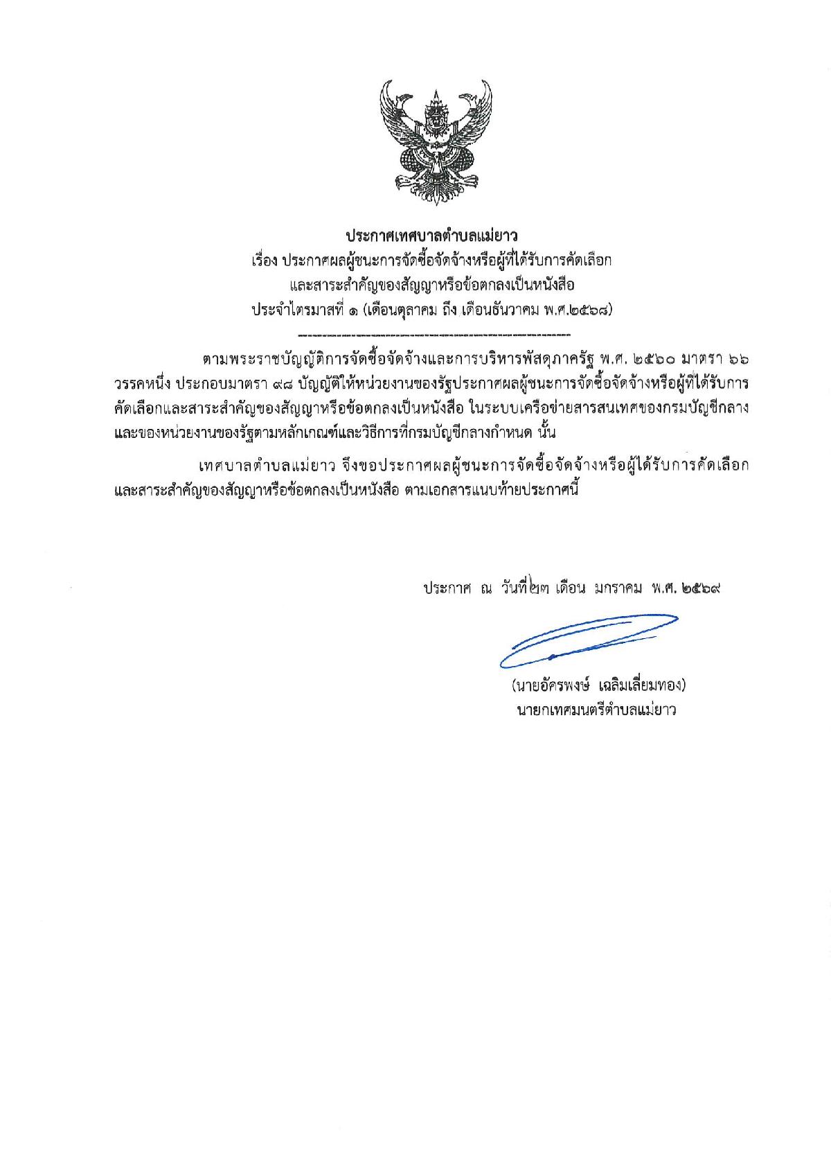 ประกาศผู้ชนะการจัดซื้อจัดจ้างหรือผู้ได้รับการคัดเลือก ตามพรบ.จัดซื้อจัดจ้างฯ2560 มาตรา 66 ประจำไตรมาสที่ 1 (เดือนตุลาคมถึง เดือนธันวาคม2568)